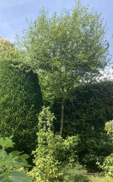 Im hinteren Teil des Gartens neben einem Eibenkegel und vor einer Feuerdornhecke.