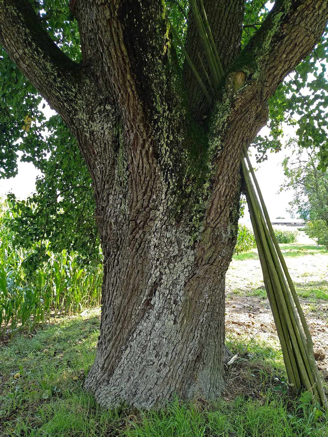Krone hochoval, dicht belaubt, sieben Kronenäste am Ansatz. Stamm leicht rechtsdrehend, sehr massig, leichte Borkenschäden, rostige Metallkette eingewachsen.