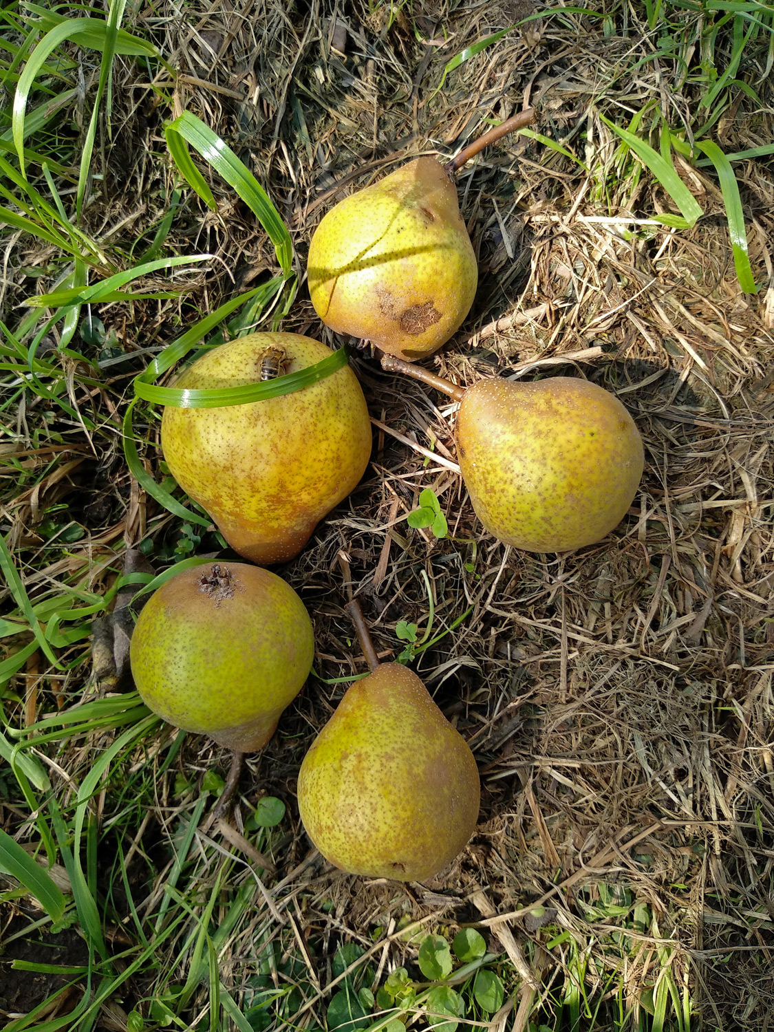 Brenn-, Kompott- und Dörrbirne. Herkunft unbekannt, 1854 erstmals von E. Lucas erwähnt. Früchte am 6.9.2024 überwiegend abgefallen, um 70 x 60 mm, oft birnenförmig, kelchbauchig, am Baum grün, bei Reife gelb bis bräunlich-gelb. Berostung vor allem im Kelch- und Stielbereich. Stiel kräftig, 15-25 mm, braun. Kelchgrube flach bis mitteltief, Kelchblätter schmal, spitz, meist nach außen liegend.