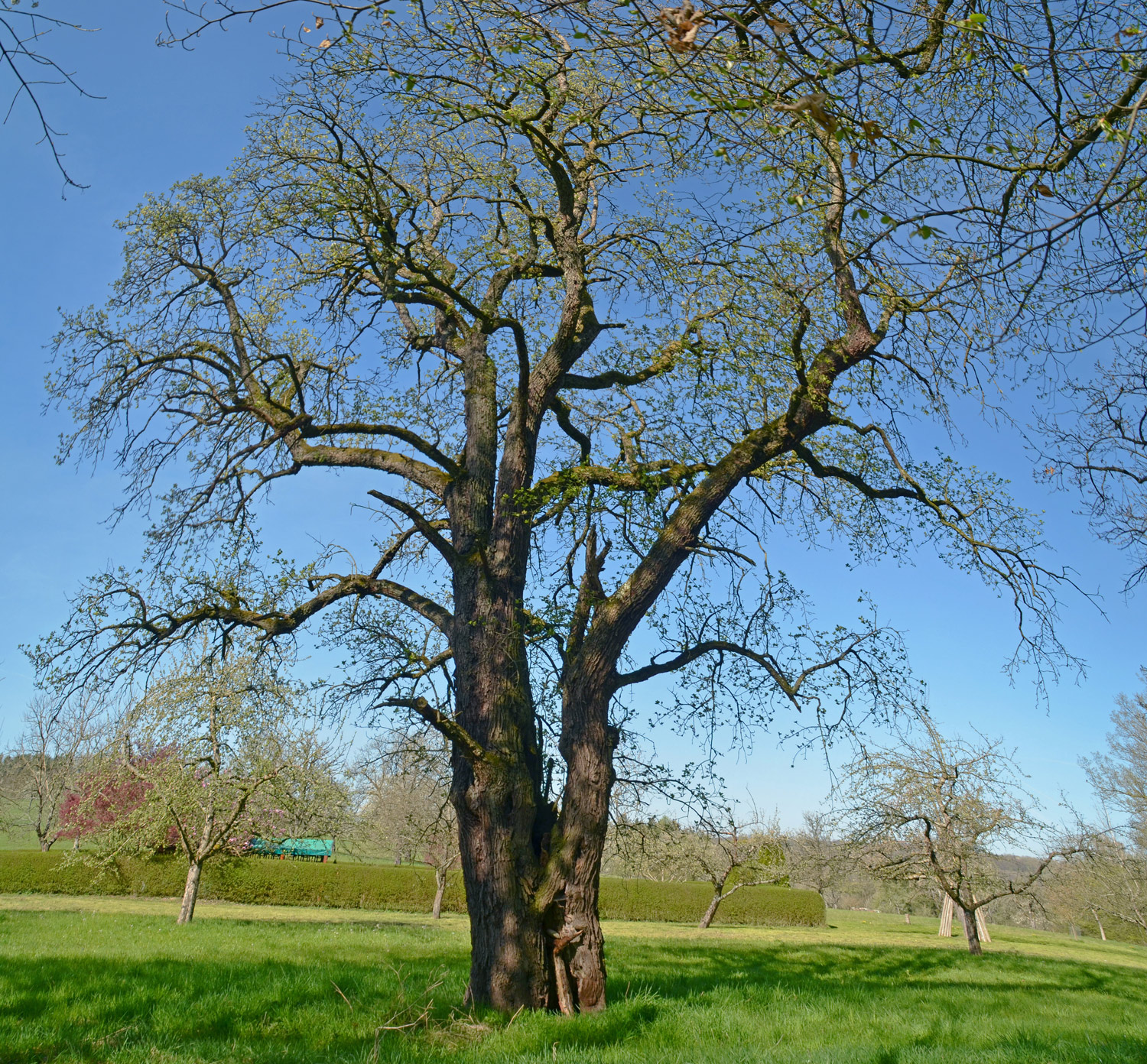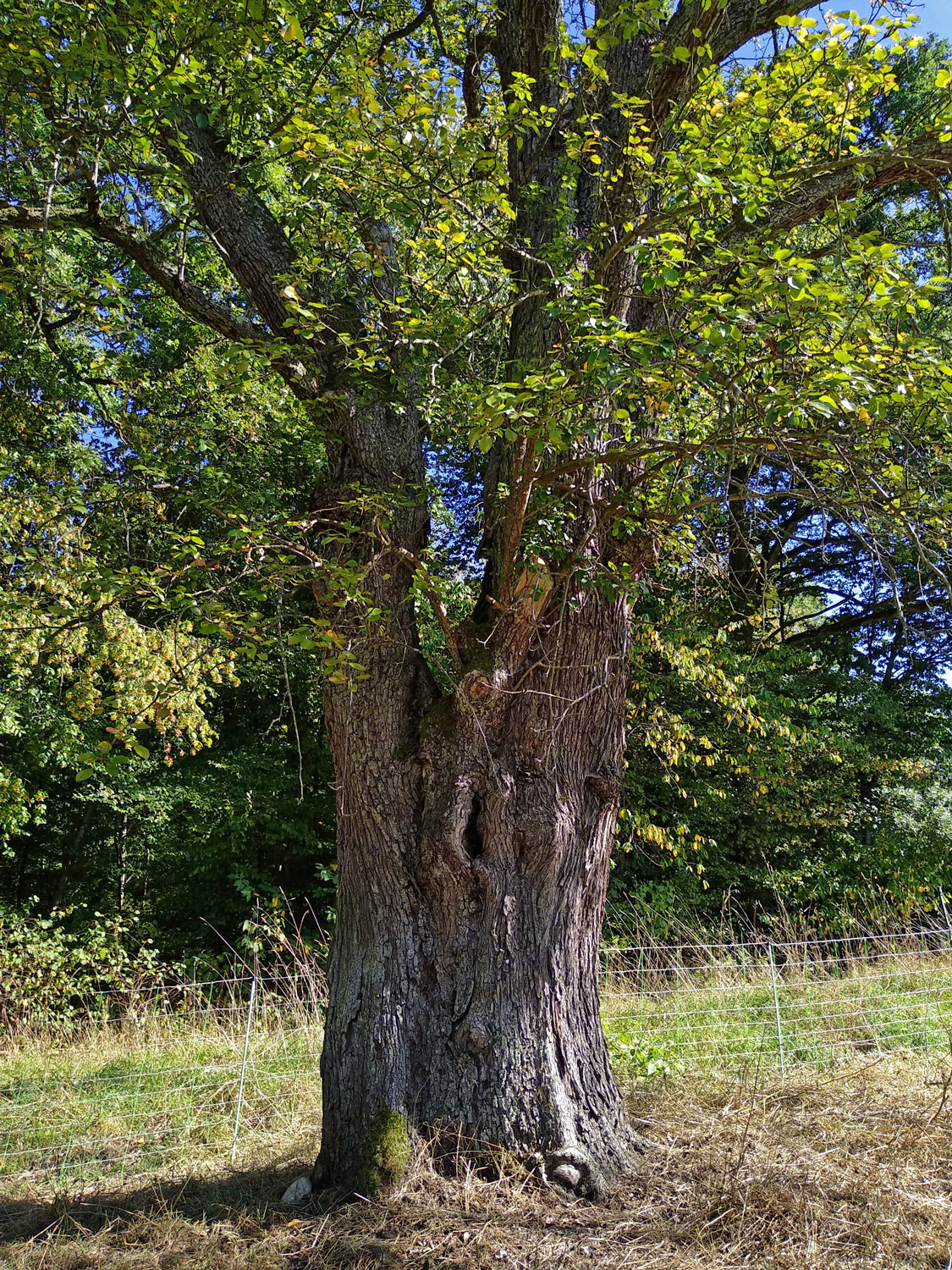 Stamm teilt sich bei 1,8 m Höhe in zwei ungleiche Hauptachsen auf, die ungesichert sind. Beim nächsten größeren Sturm könnte der stammhohle Baum auseinander brechen. Etliche Trockenäste, doch altersbezogen noch recht vitaler Zustand.