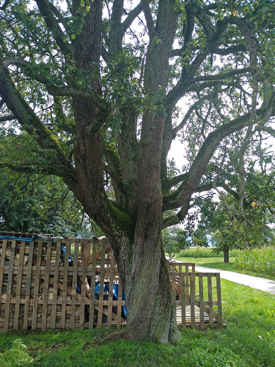 Krone rundlich, Kronenansatz bei 2,2 m, dort in sieben Stämmlinge sich aufteilend. Stamm deutlich rechtsdrehend. Fruchtkörper von Porlingen an Stamm und auf Ästen zeigen massiven Pilzbefall an.