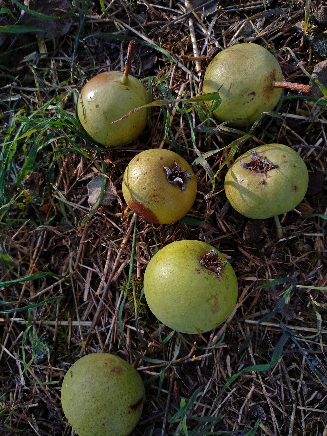 Most- und Brennbirne. Herkunft unbekannt, 1823 erstmals beschrieben. Unfassbar viele Früchte am Boden (24.9.2023), meist braun und teigig. Ansonsten grüngelb, klein (ca. 40 x 45 mm), wenig berostet mit weißlichen Lentizellen-Höfen. Stiel kurz, ca. 15 mm.