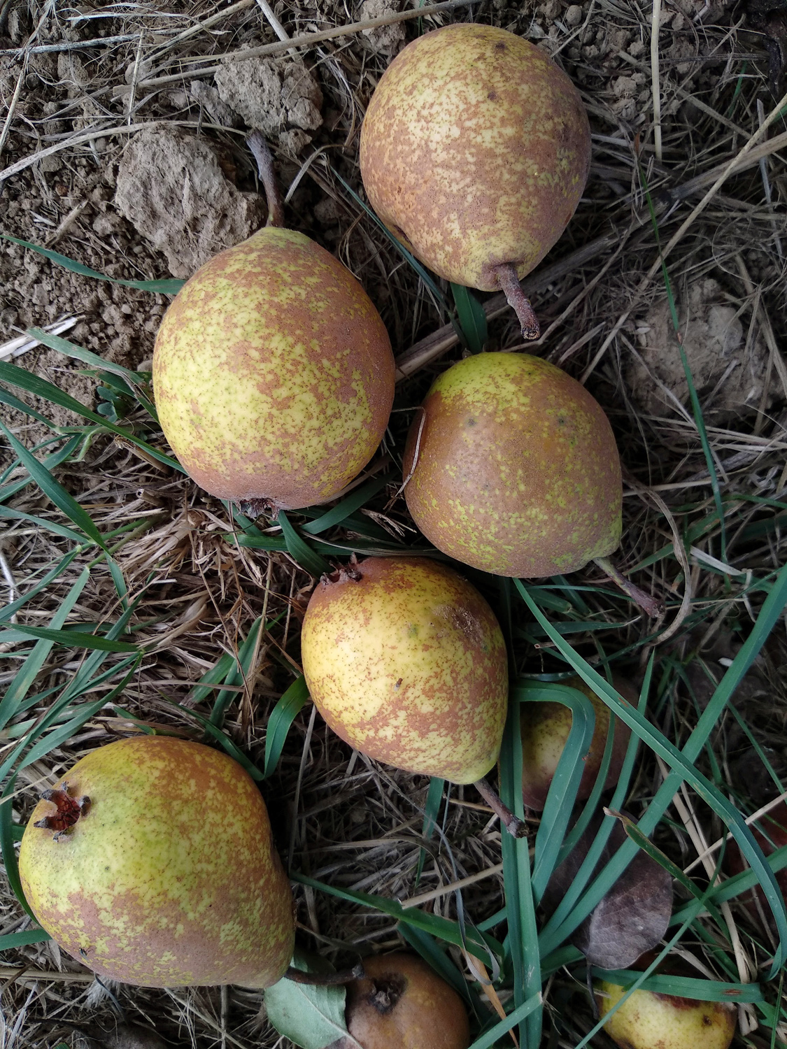 Most- und Dörrbirne. Herkunft unbekannt, 1854 erstmals von E. Lucas beschrieben. Früchte am 10.10.2023 länglich-eiförmig, meist um 55 x 45 mm groß, am Baum grün, am Boden gelb, dann braun. Berostung ausgeprägt und unregelmäßig verteilt. Stiele braun, um 25 mm lang.