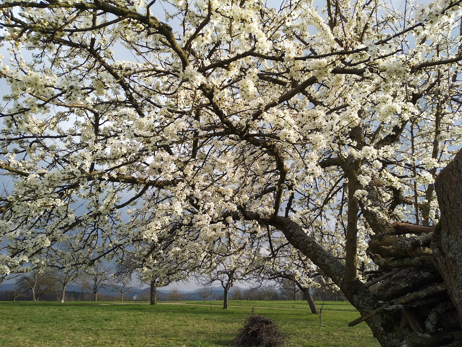 Durchtrieb der Unterlage einer Kultur-Pflaume, deren Stamm bei ca. 1,8 m Höhe gekappt wurde. Das abgesägte Holz ist wie ein Scheiterhaufen gestapelt. Unterirdische Pflanzenteile vermutlich über 80 Jahre alt.