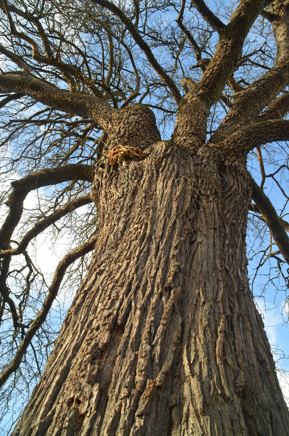 Most- und Brennbirne. Zufallssämling aus der Schweiz, seit etwa 1780 verbreitet. Gerüst-Veredelung bei 2,3 m Höhe: Äste grobrissig gefeldert, Stamm dagegen ausschließlich längsrissig, in groben Streifen. Schwefelporling am Kronenansatz.