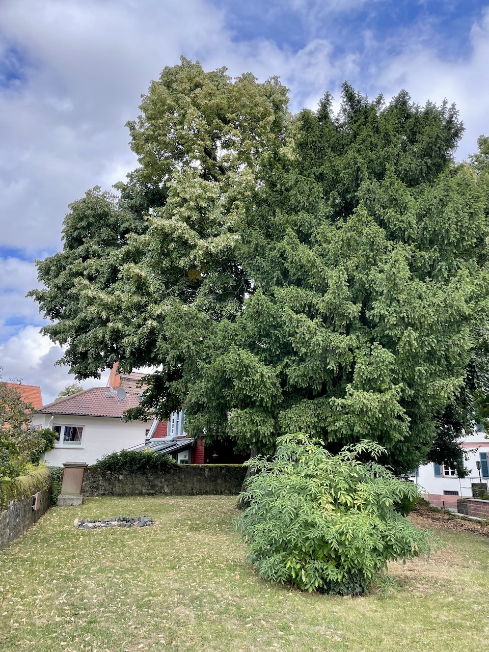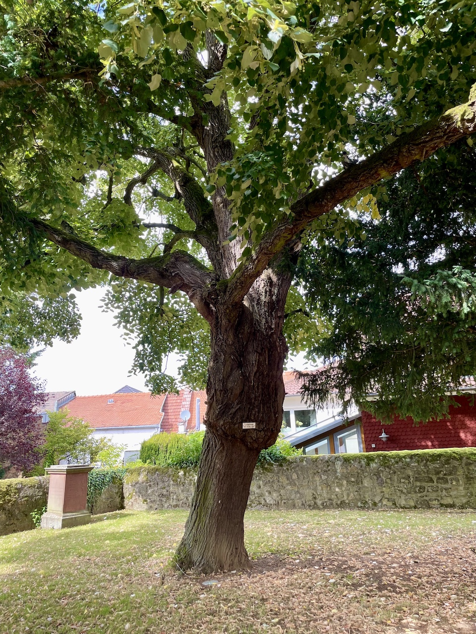 Die Linde steht unter Druck benachbarter Gehölze (Eiben) und konnte sich dadurch nicht optimal entwickeln. Stärkere Rückschnitte in der Krone haben stattgefunden. Die Veredlungsstelle befindet sich in ca. 180 cm Höhe.