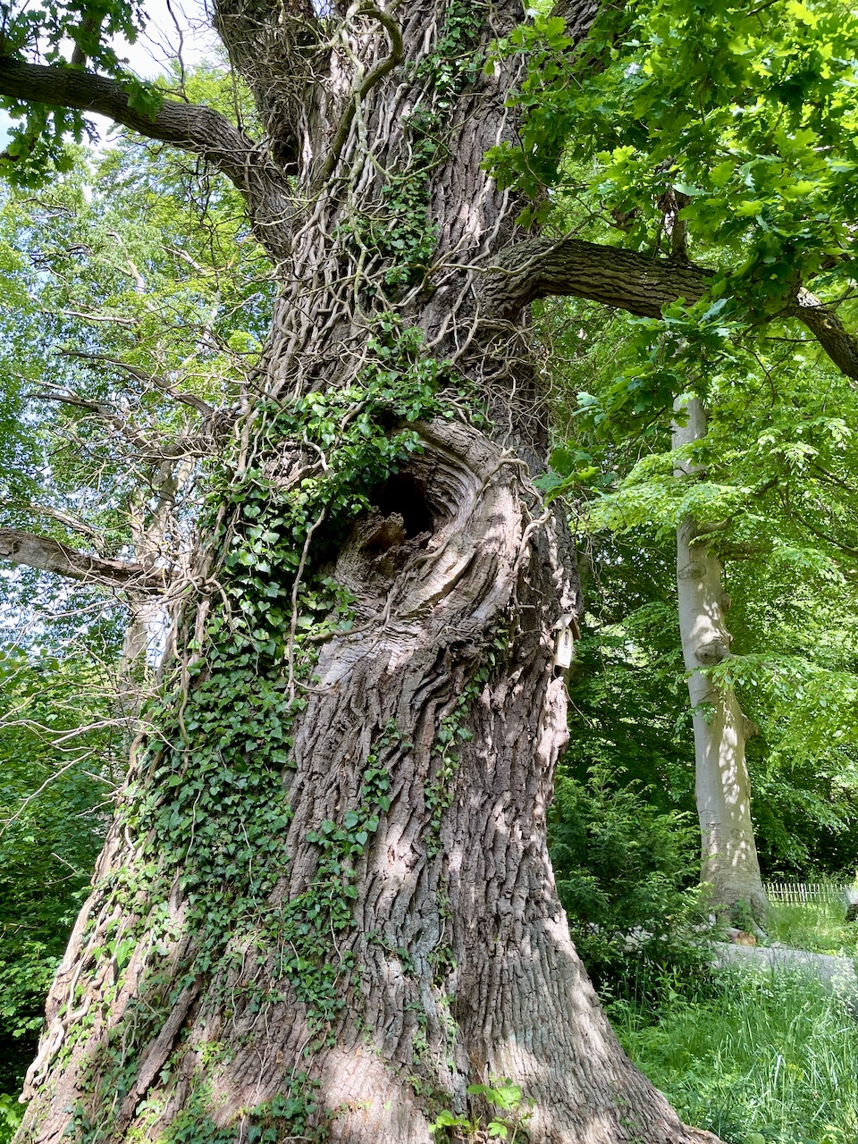 Etwas einseitig ausgebildete Krone, Stamm mit Efeu bewachsen, einige Starkastausbrüche, die recht gut verheilt sind.