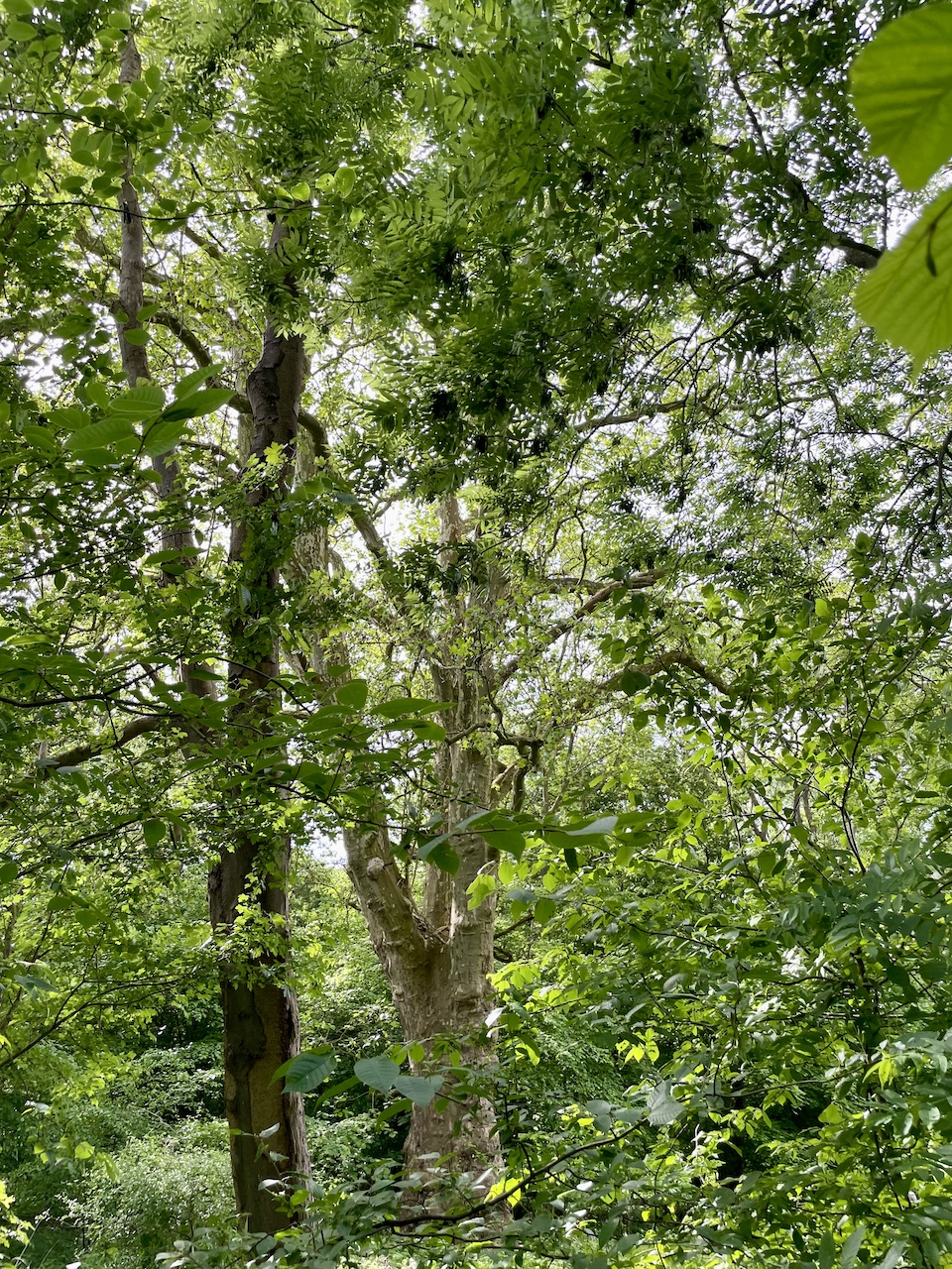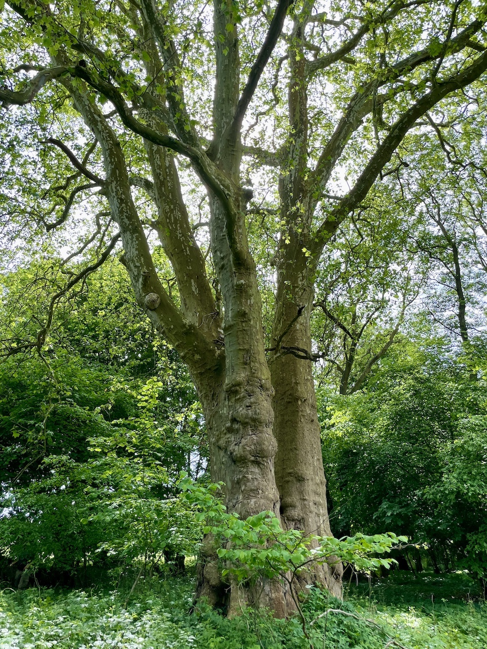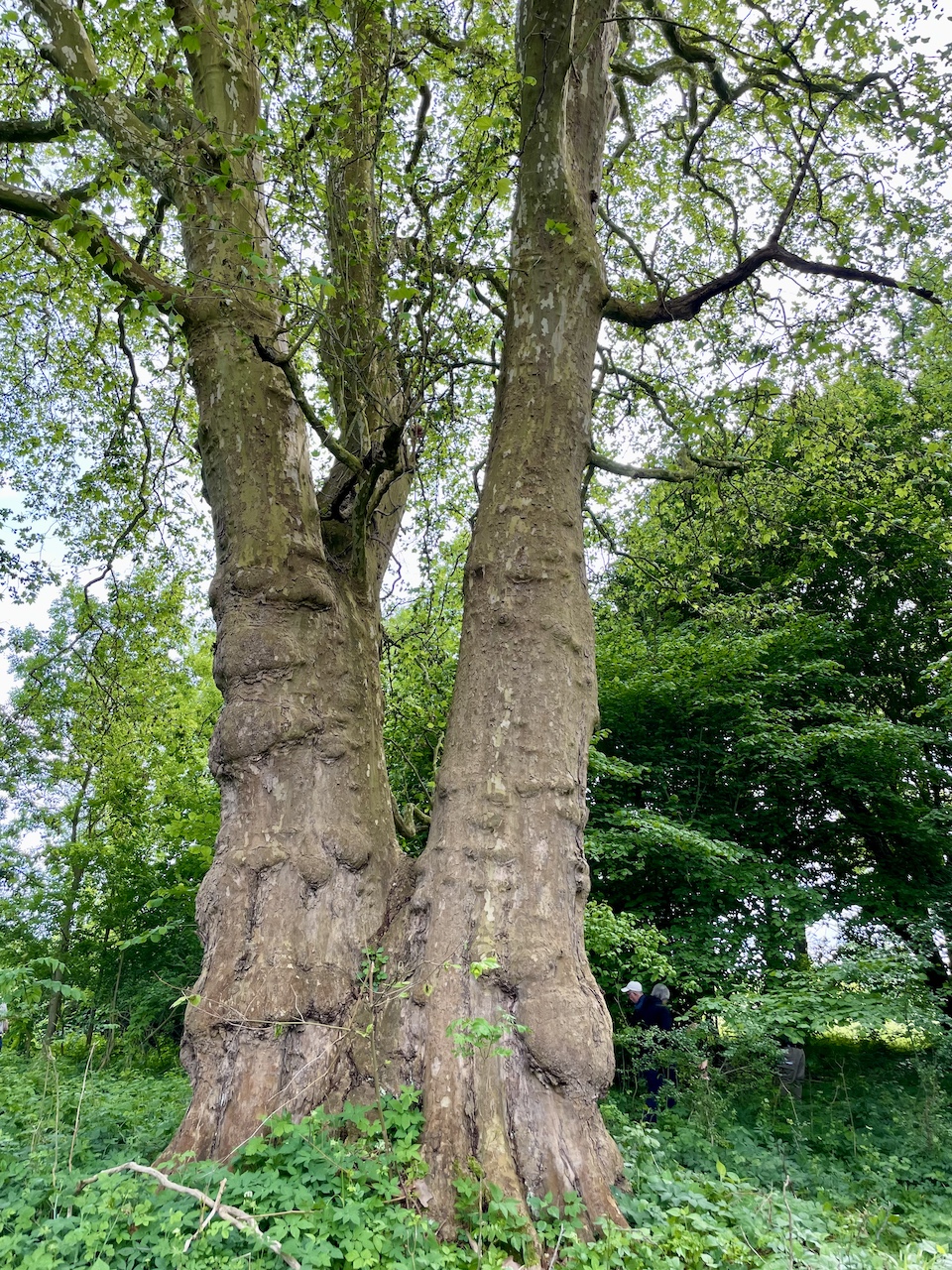 Zwei vollständig miteinander verwachsene Stämme, also sicher zweikernig, der eine Stamm verzweigt sich in ca. 8 m Höhe ein drittes Mal und davon wiederum einer der Teilstämme knapp darüber ein weiteres Mal, sodaß aus der Entfernung der Eindruck eines drei- bis vierstämmigen Bames entsteht.