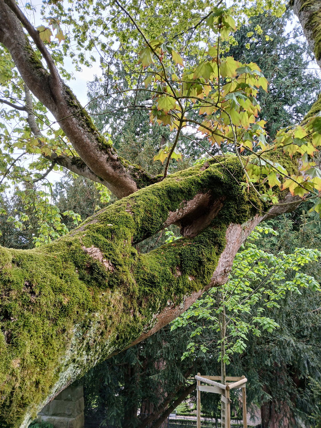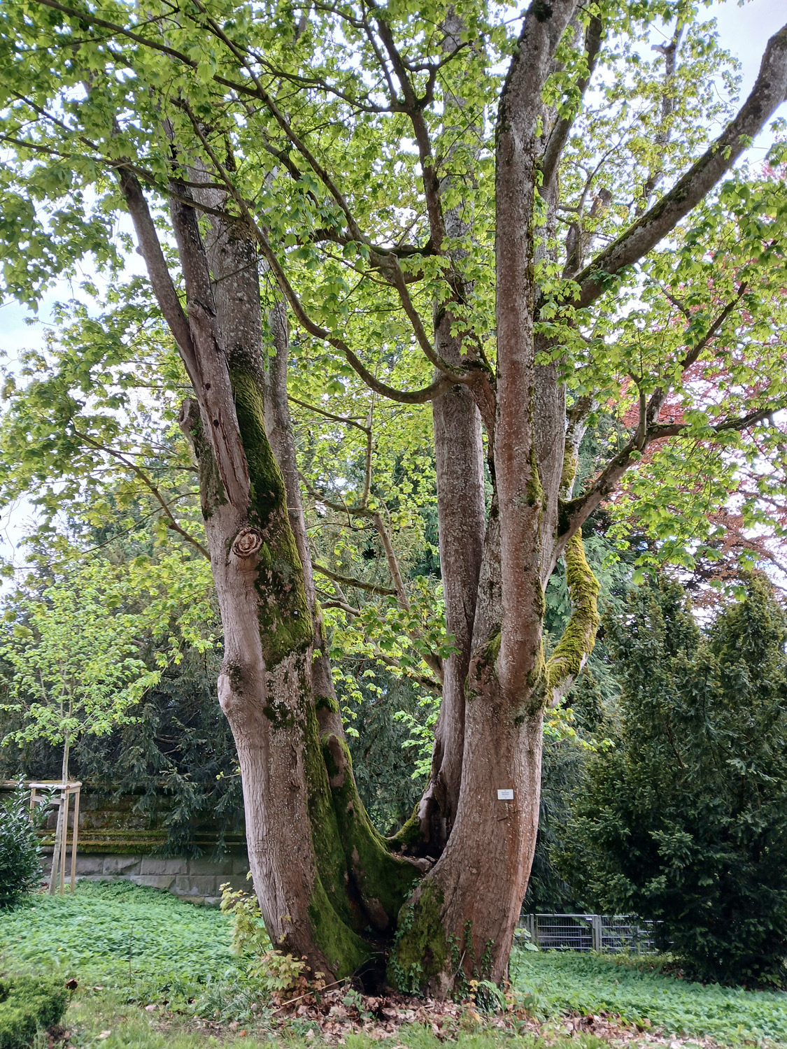 Krone erkennbar verlichtet, drei Haltebänder, Spechtlöcher, starker Moosbewuchs auf den Oberseiten, sowie ein Entwässerungsrohr am Stammfuß.