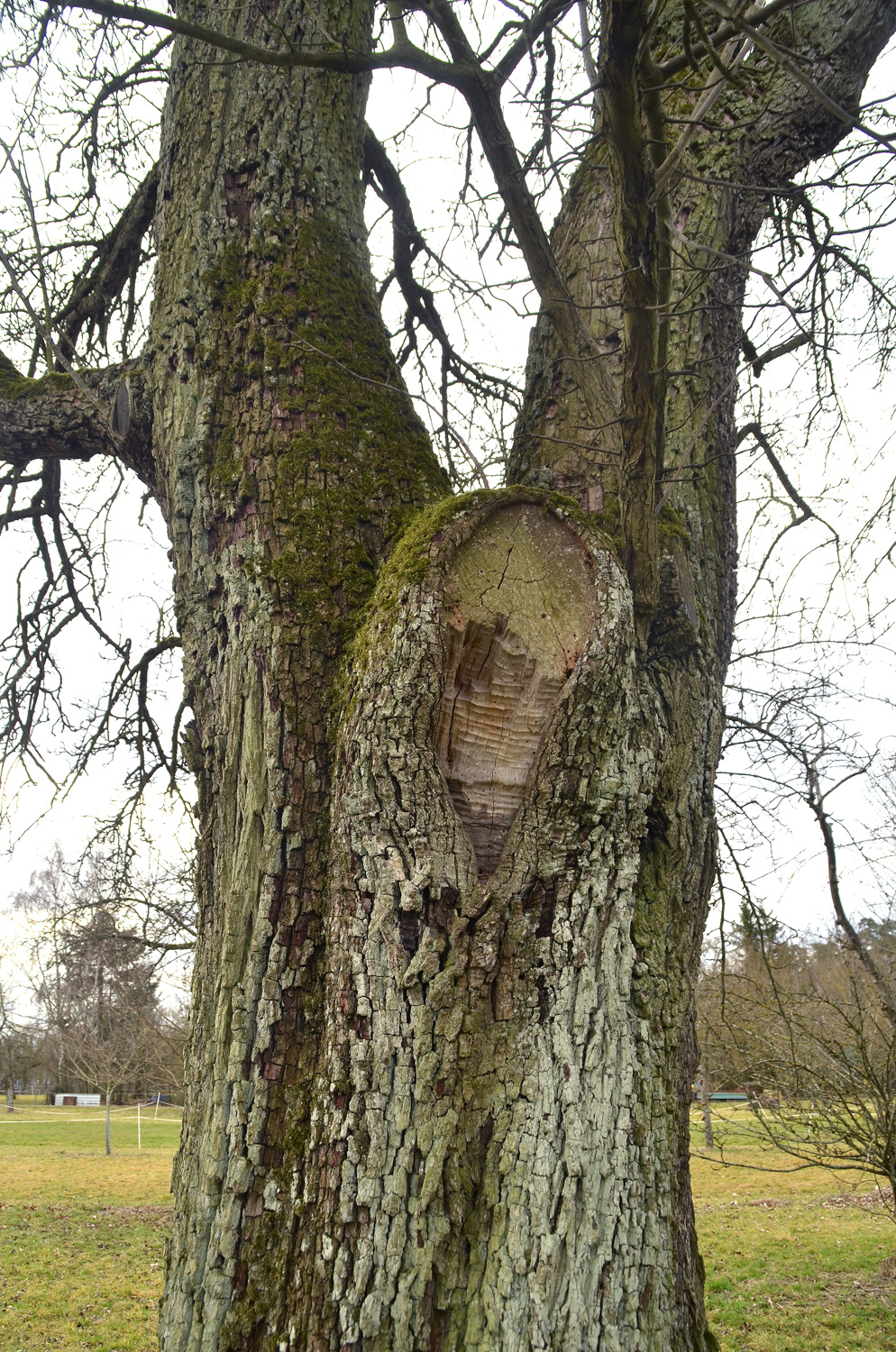 Krone mit zwei Hauptachsen ab 2,2 m Höhe. An der Gabelung offener Ausbruchschaden und ein abgenommener dritter Stämmling.