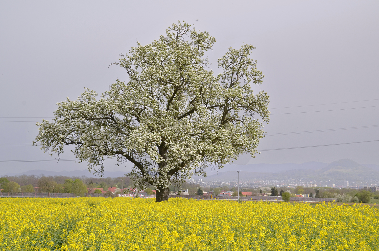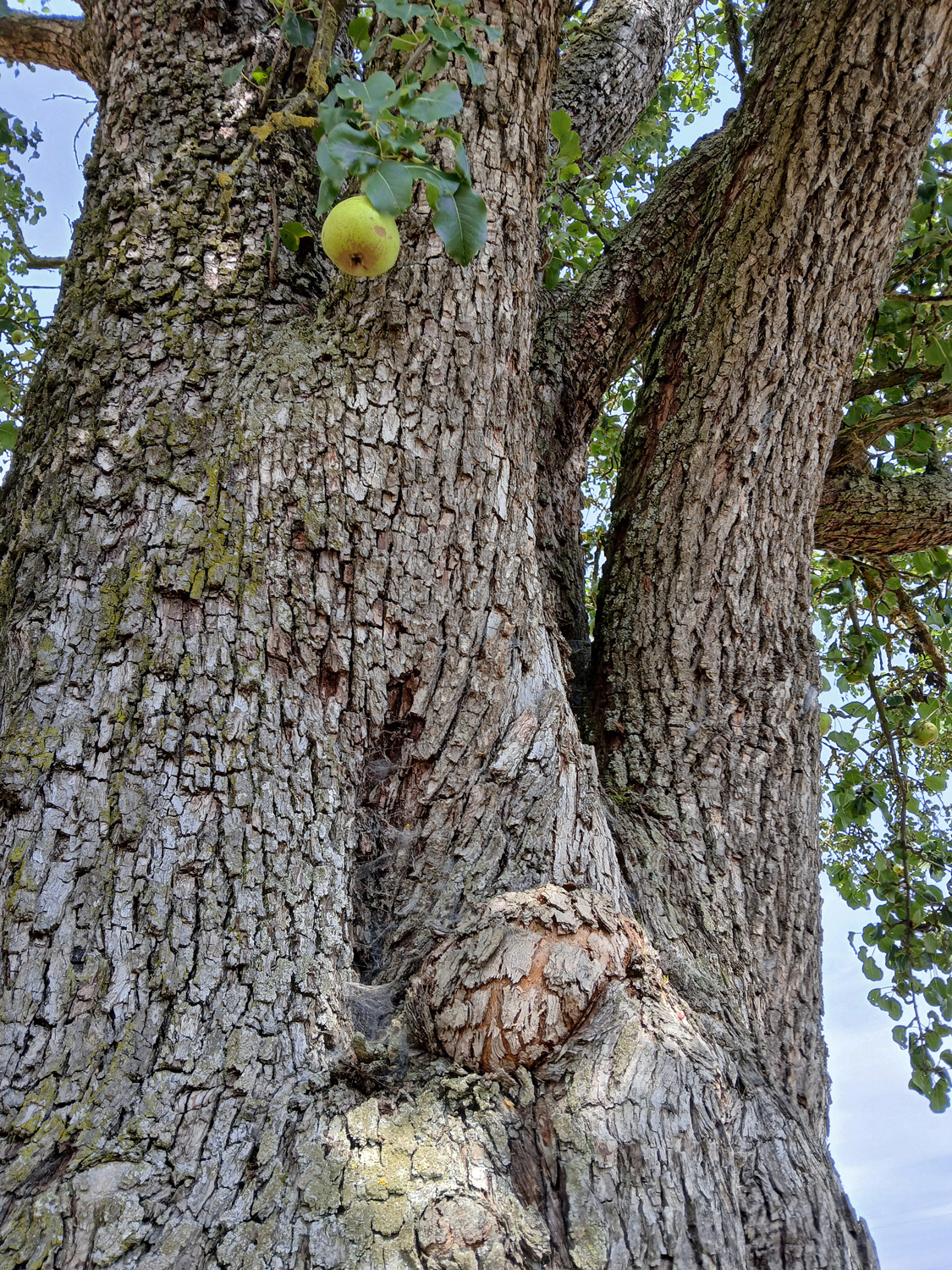Einzel stehender, landschaftsprägender Feldbaum. Veredelung wahrscheinlich am Fuß.