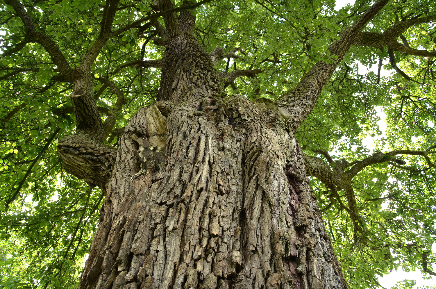 Die Krone wird vor allem durch die Zentralachse aufgebaut, erster Seitenast bei 2 m Höhe, ein zweiter folgt gegenüber. Borke sehr dick, eichenartige Stränge, teils auch gefeldert. Reste einer Betonverfüllung in einer Ausbruchs-Öffnung, starker Pilzbefall. Belaubung noch vergleichsweise dicht.