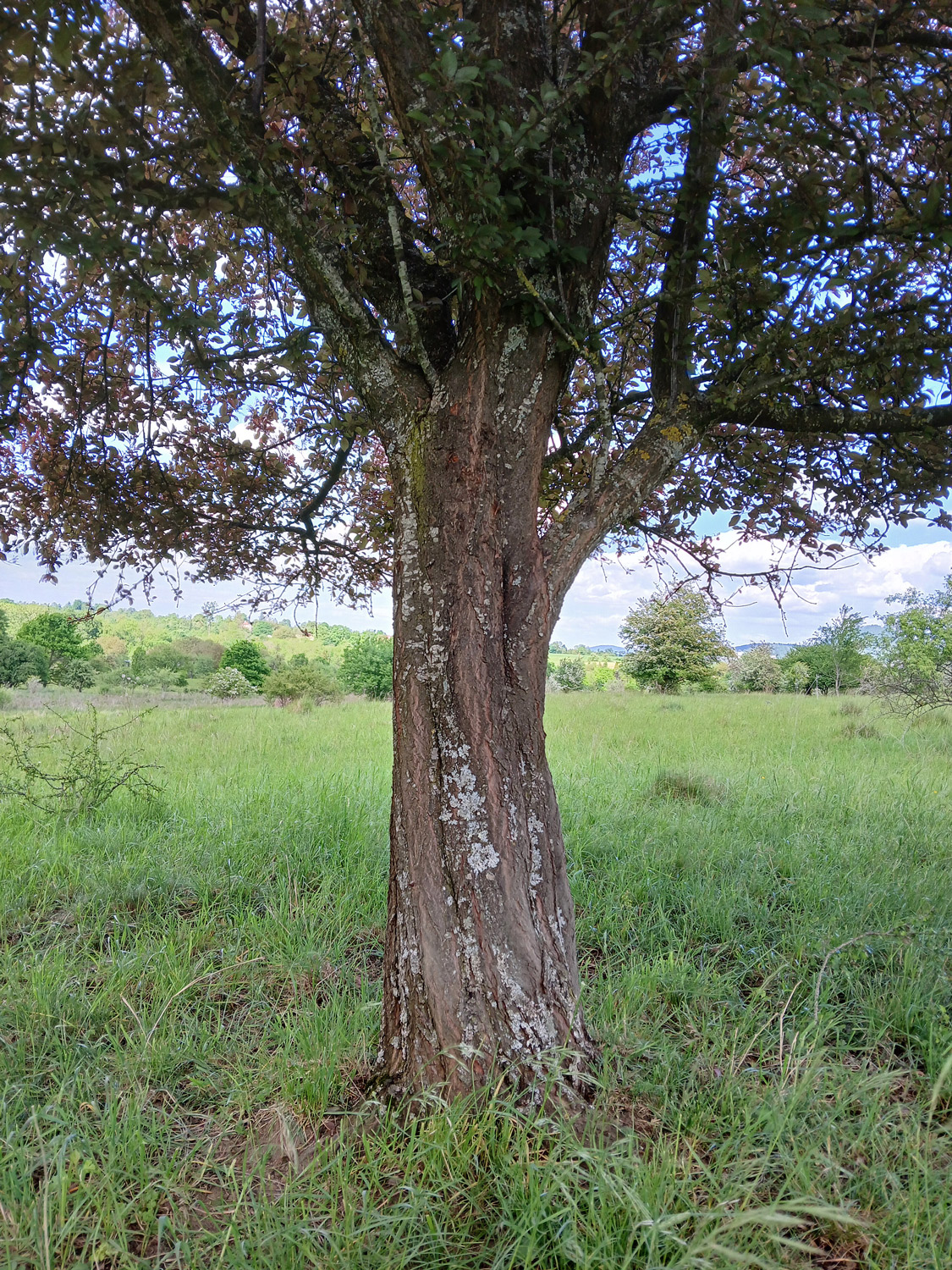 Einstämmig bis ca. 1 m Höhe, schöne Rundkrone, Messung bei 80 cm Höhe (Taille). Die rotblättrigen Formen der Kirsch-Pflaume sind als mehrstämmige, strauchförmige Gehölze recht häufig in Gärten anzutreffen – in Baumform jedoch selten. Im 124 ha großen NSG Listhof gibt es nur zwei Exemplare.