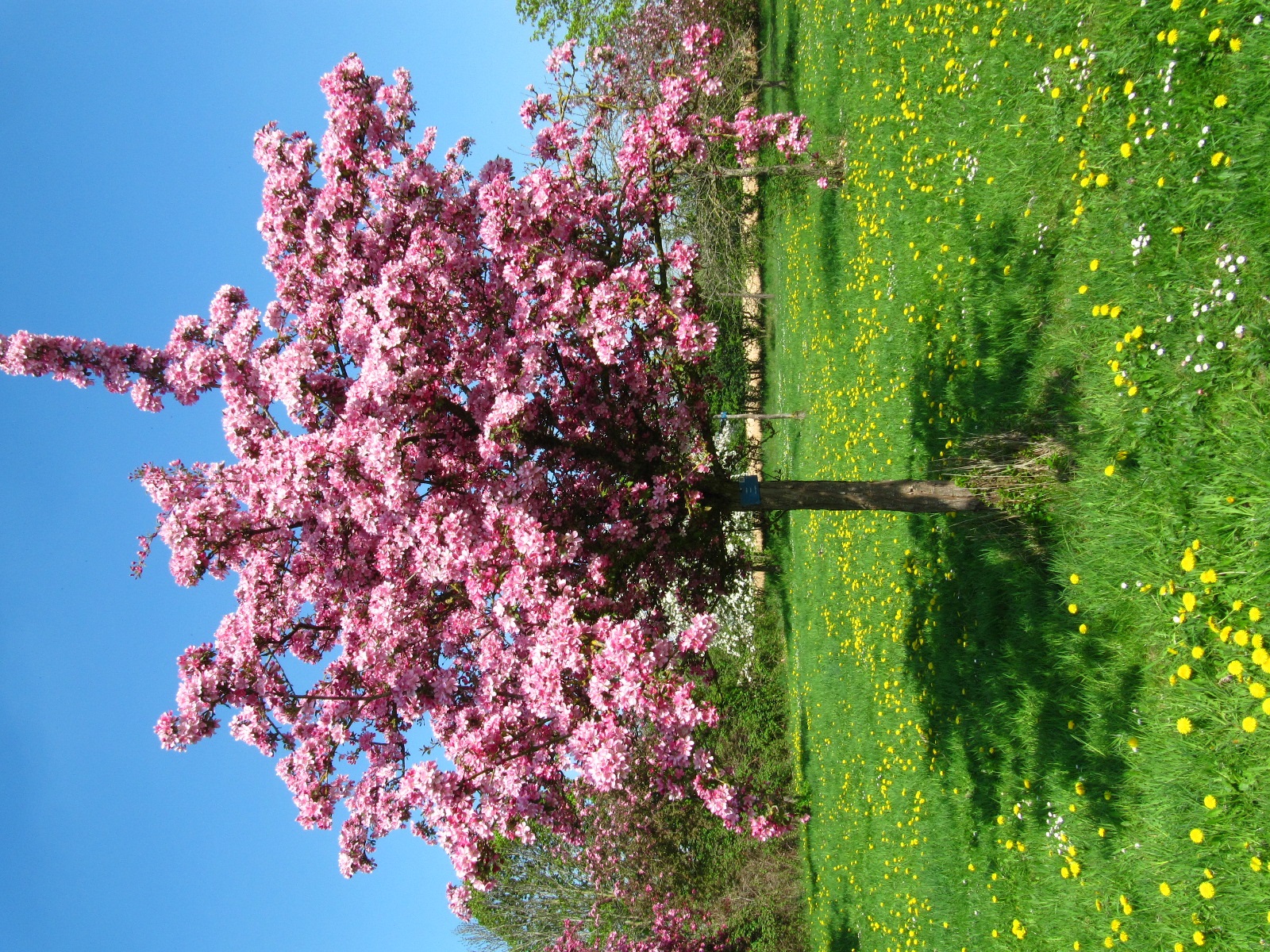 Arboretum am Schloss Erbhof. Zier-Apfel-Quartier, 2 Reihen am NW Rand. Hier 2. Reihe, derzeit hinterster, vitaler Zier-Apfel.