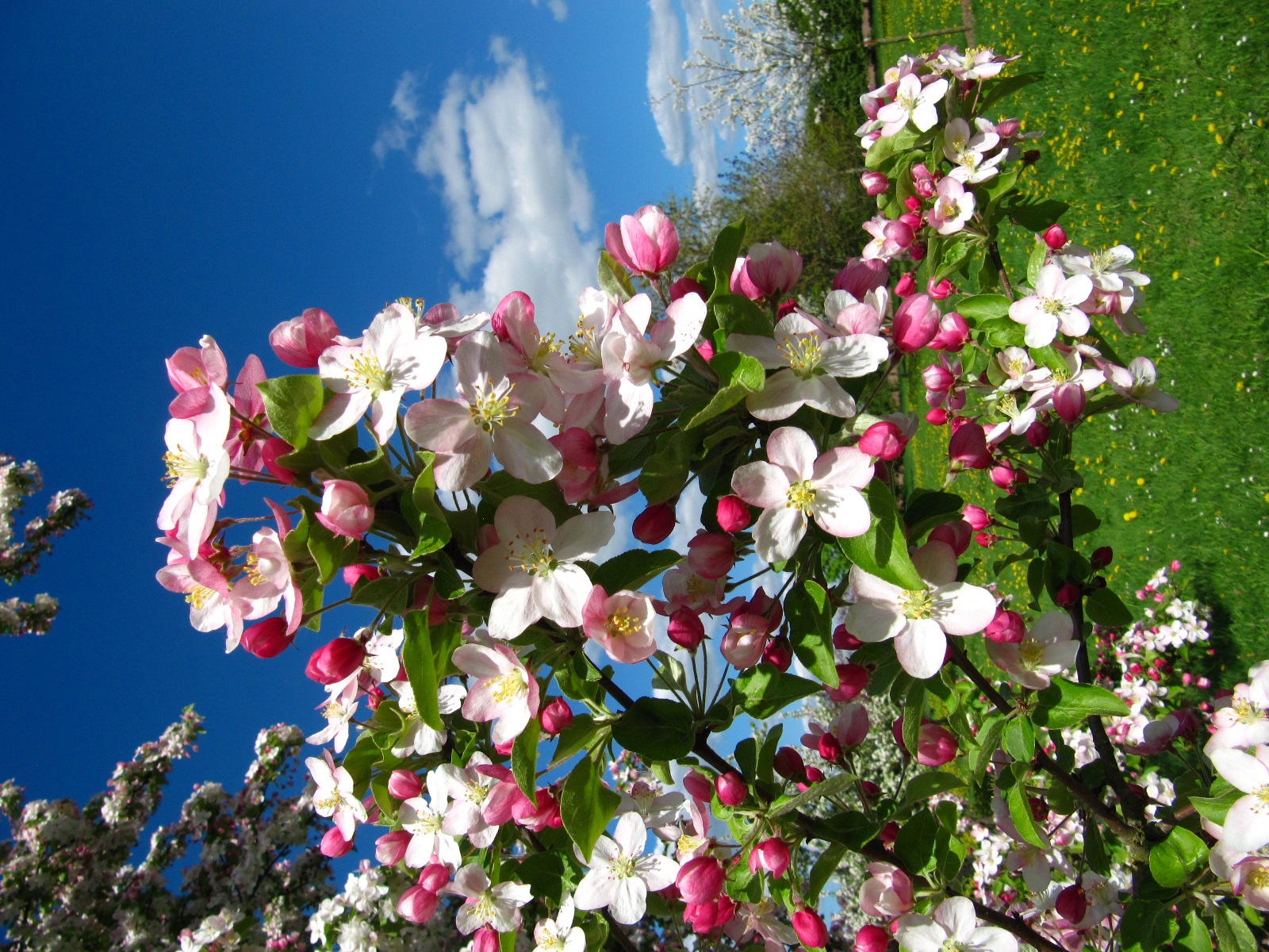 Blüte zartrosa, nach weiß aufhellend. Knospen intensiv rosarot. Deutlich duftend und reicher Bienenanflug. Früchte gelb-orange.