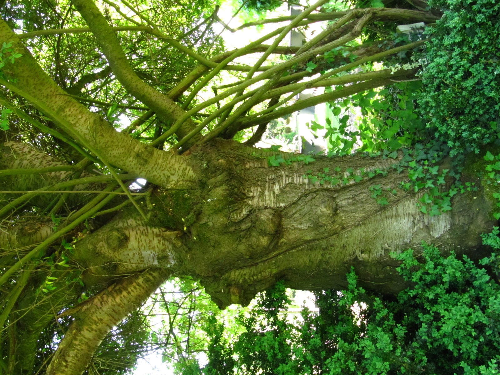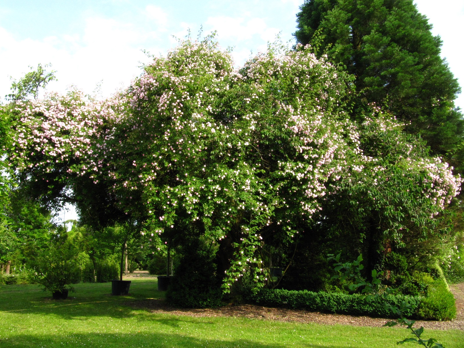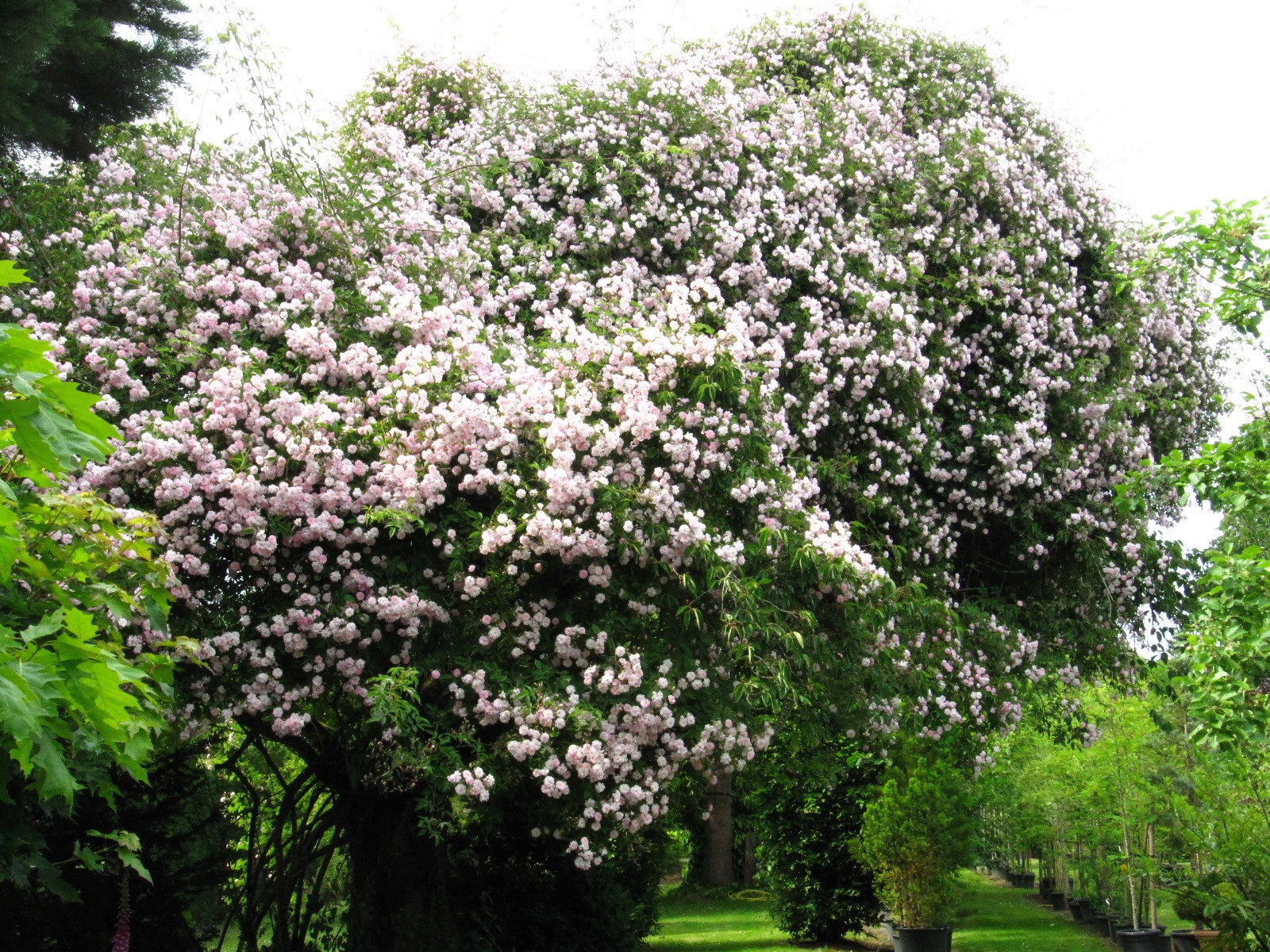 Der Baum dient nur noch als Tragegerüst der Ramblerrose 'Paul's Himalayan Musk'. Lediglich drei oder vier Zweigenden schauen noch aus dem Rosengehölz heraus.