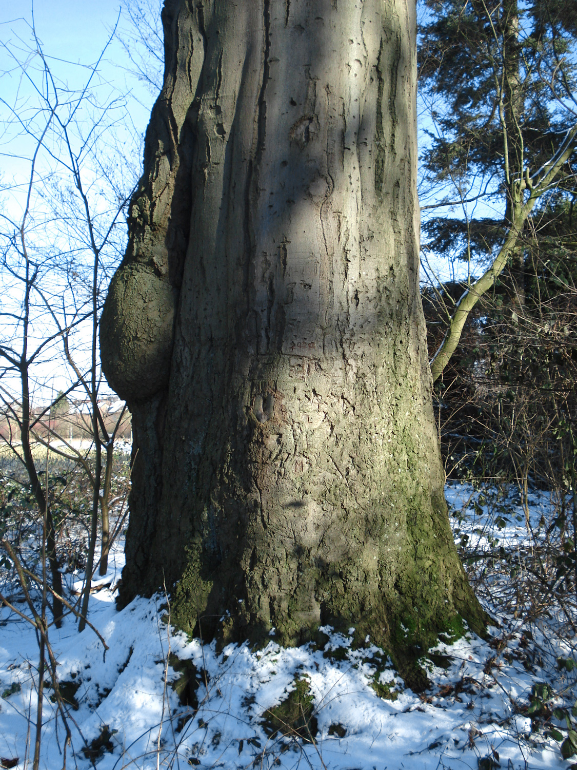 Messung des Umfangs direkt unterhalb einer markanten Stammwucherung. Alter geschätzt nach Art / Umfang gemäß Baumportal.de.