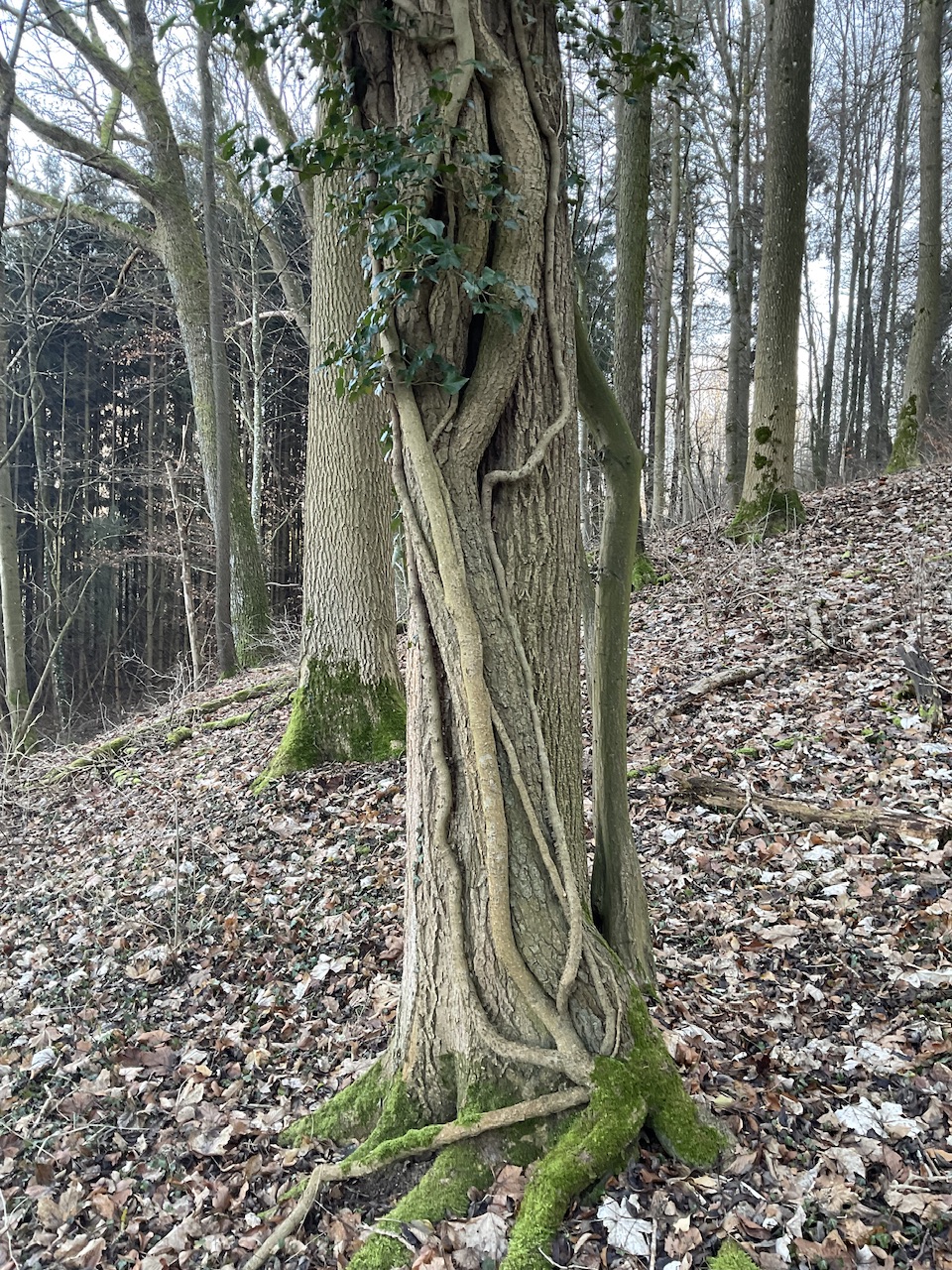 An Esche klimmend, die selbst an die 35 m hoch ist.