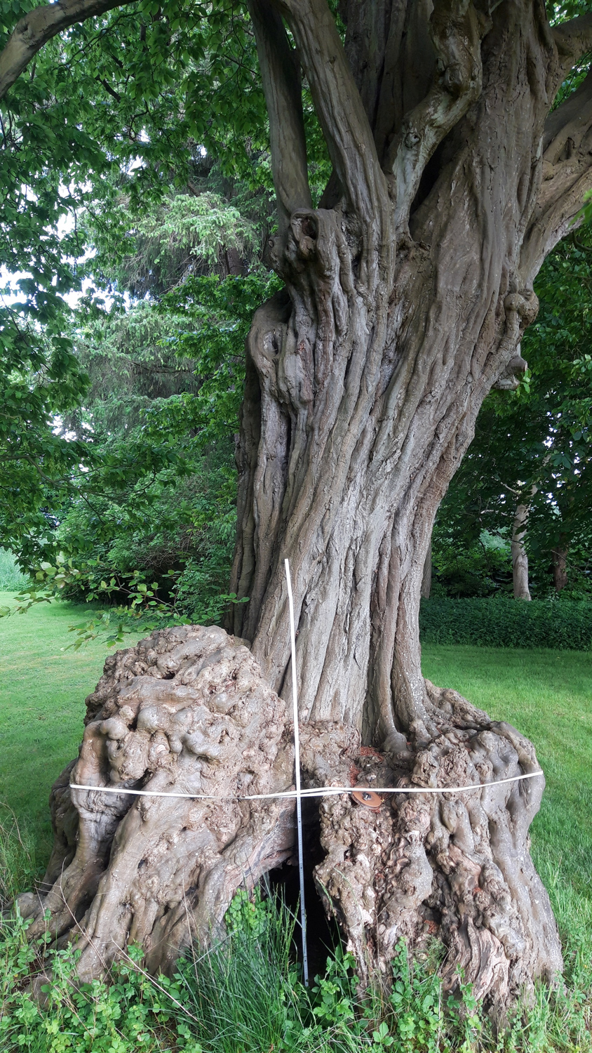 Es handelt sich um ein sehr altes Exemplar, wie ein über 100 Jahre altes Foto der Eigentümer zeigt, auf dem der Baum auch schon hohl war und fast den gleichen Habitus aufwies. Er scheint schon sehr lange mit dem Dunklen Hallimasch zu kämpfen und bisher gibt es noch keinen Sieger.