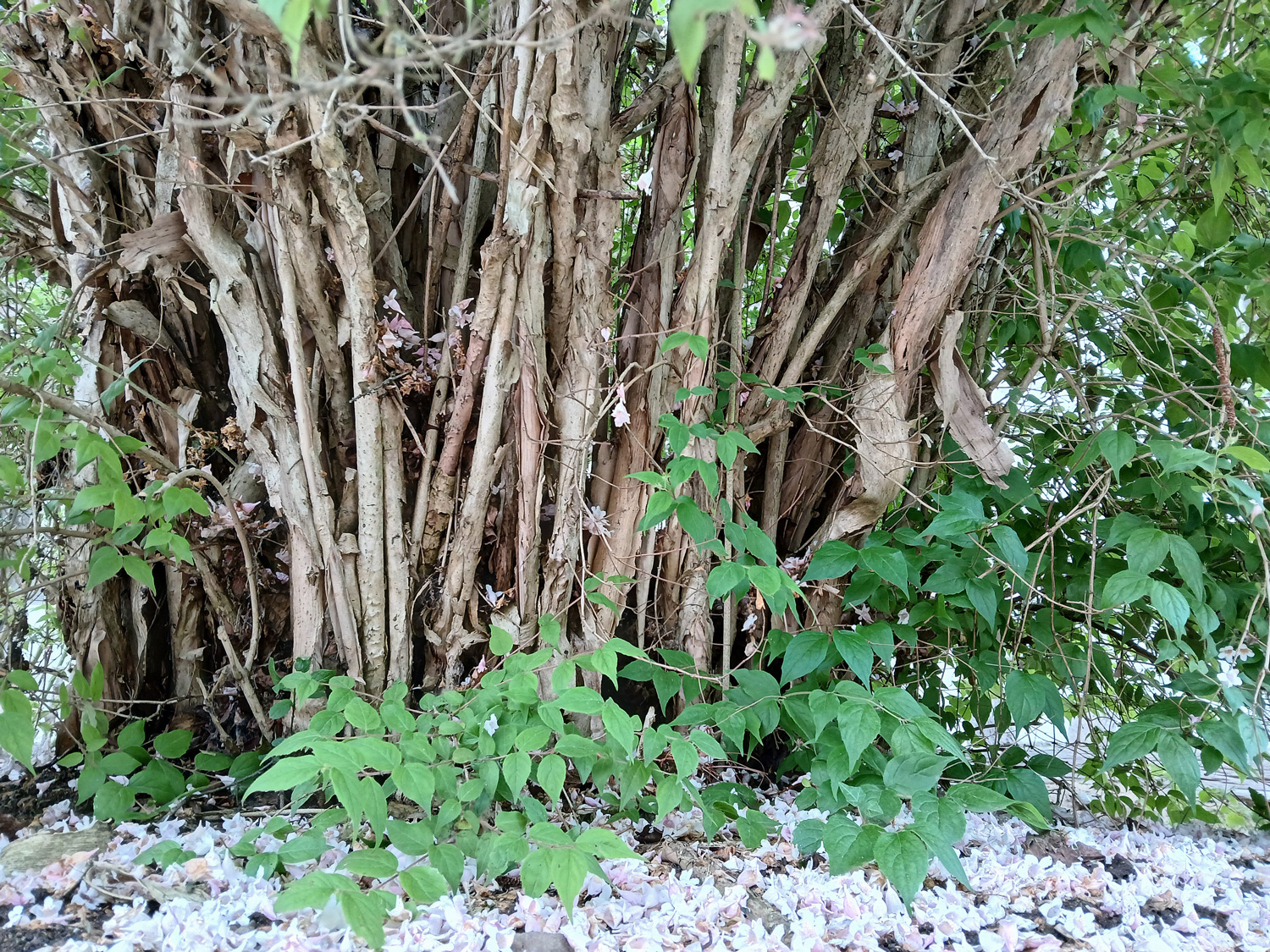 Zwei große Sträucher vor dem Haus, mit jeweils mehreren Dutzend Bodenaustrieben.