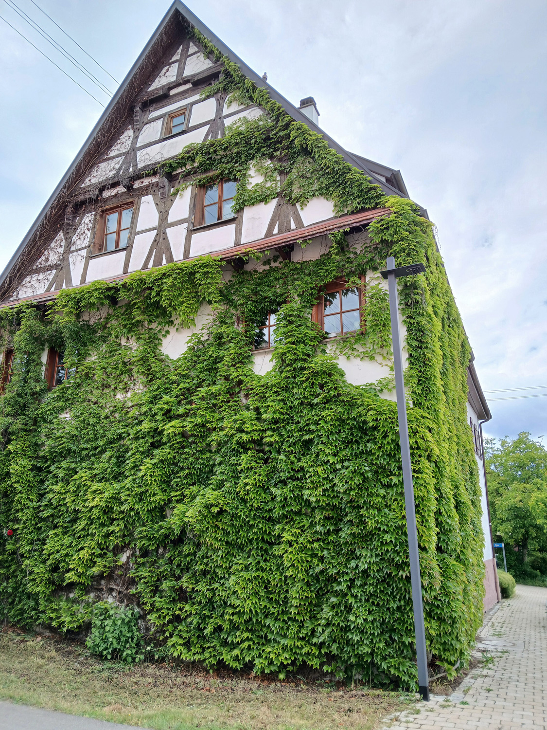 Bewächst den Südgiebel und die halbe Ostfassade des ältesten Hauses von Nehren (1485). Haupttrieb an der Ostseite, früh sich aufteilend.