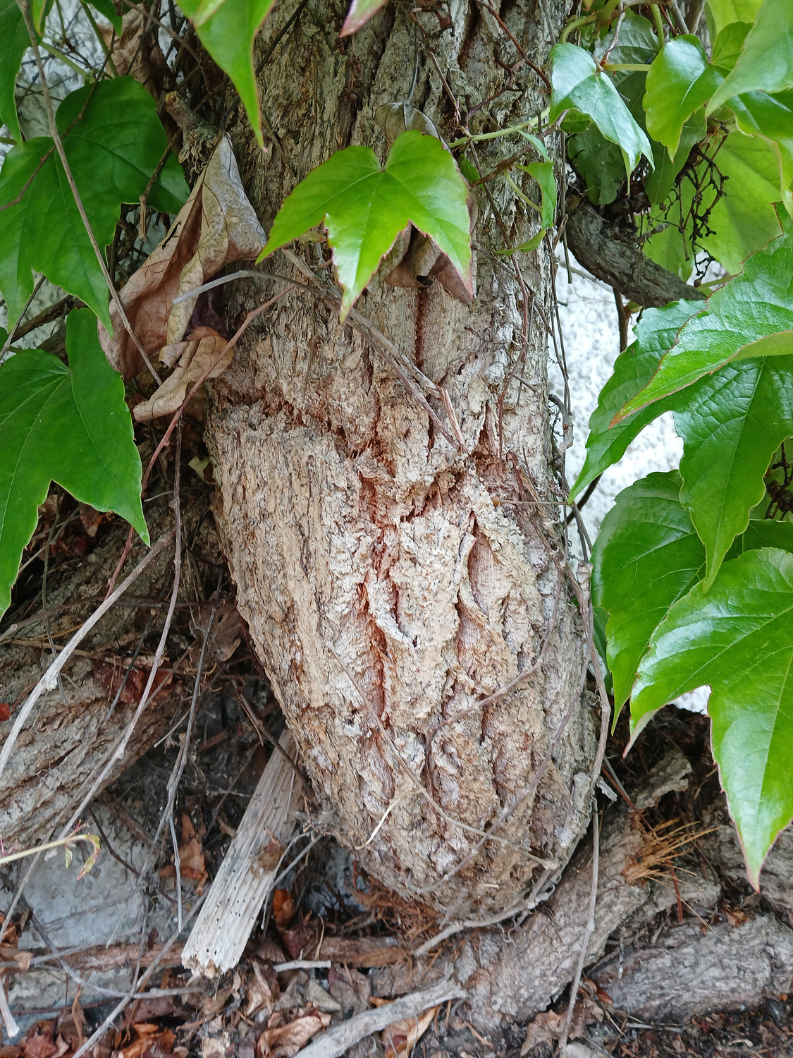Der Haupttrieb liegt der Hauswand direkt an, Umfang deshalb aus dem Durchmesser (13 cm) errechnet. Nach Angabe des Eigentümers 1991 gepflanzt.