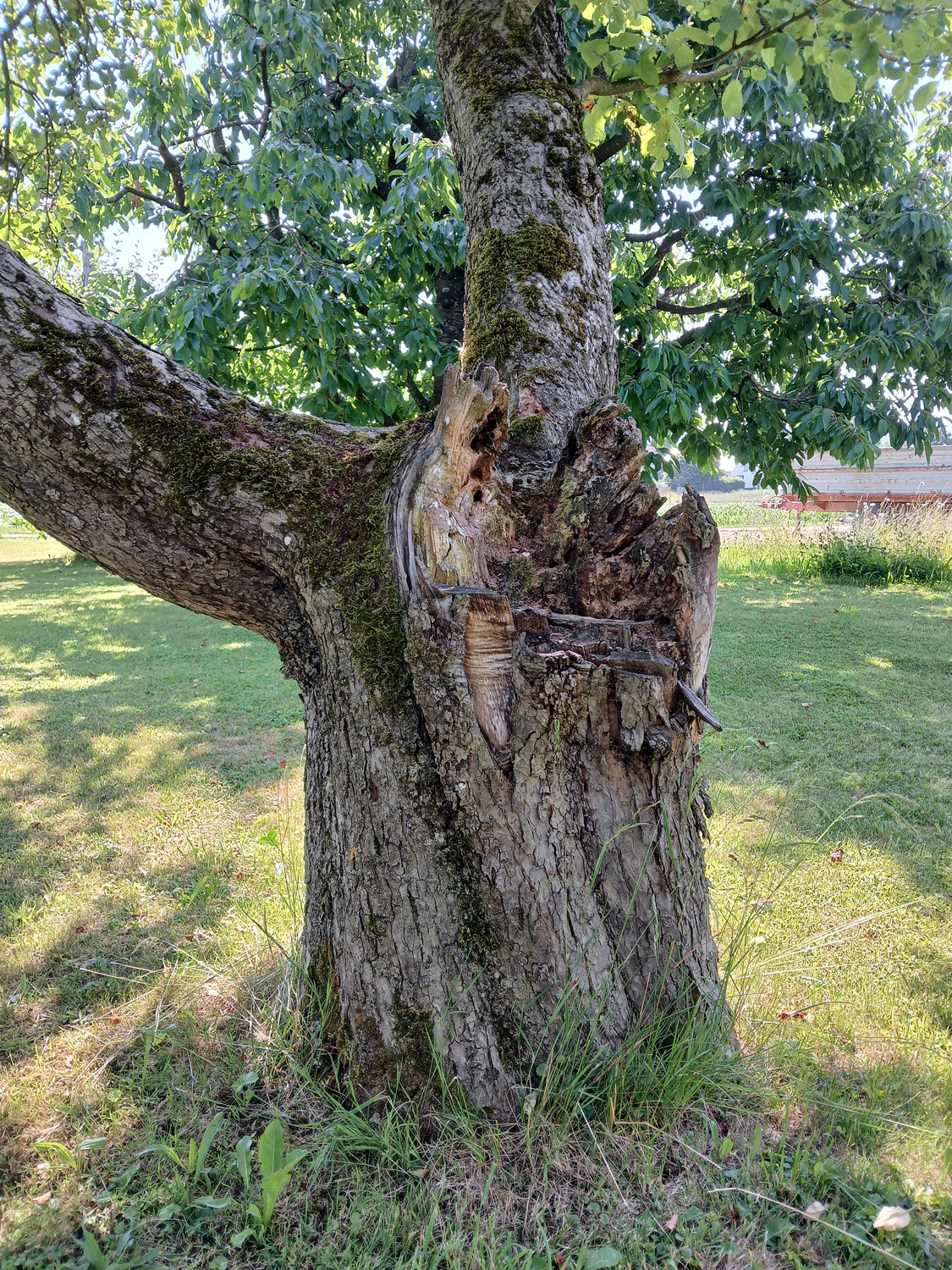 Tiefe Verzweigung bei 70 cm Höhe. Ursprünglich vier Hauptäste, davon zwei ausgebrochen, mit riesiger Stammwunde.