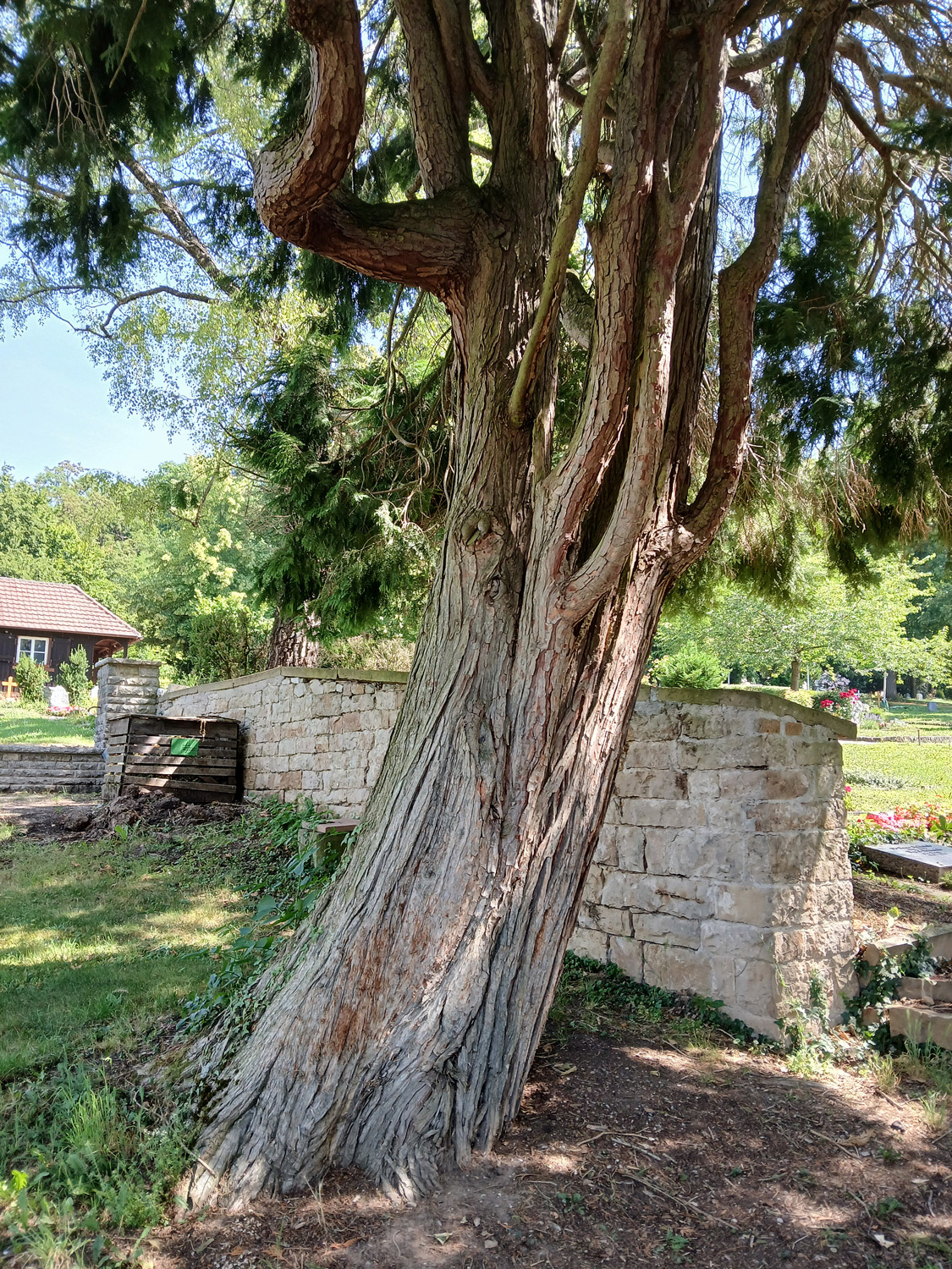 Wuchs stumpf-kegelförmig. Zwei Hauptachsen bis 1,1 m Höhe zusammengewachsen, stärkere Einzelachse misst 1,92 m Umfang (bei 130 cm), Messung Erdstamm im rechten Winkel zur Stammachse bei 50 bis 100 cm (Schrägwuchs). Markanter Drehwuchs-Ast an der schwächeren Achse.
