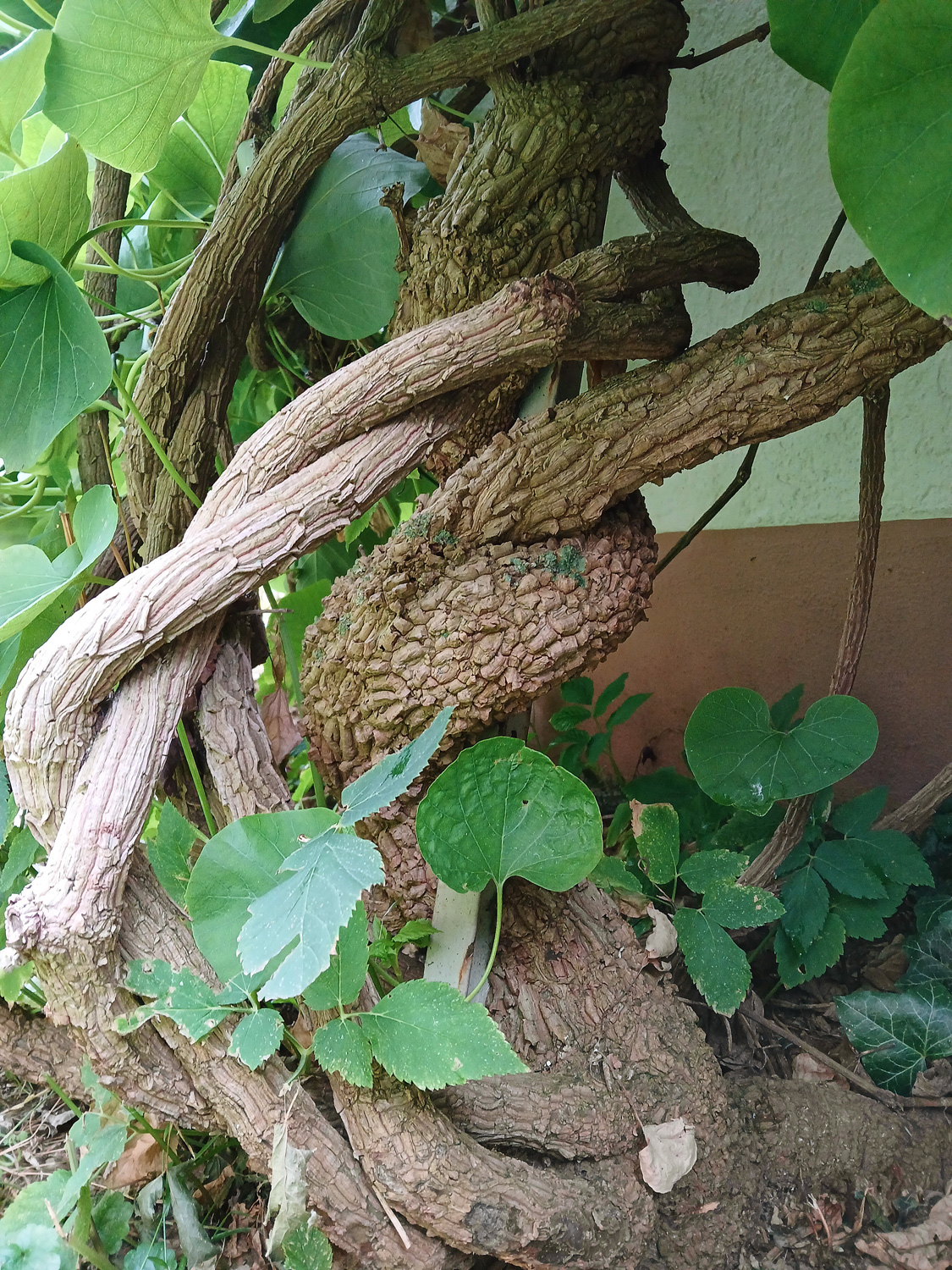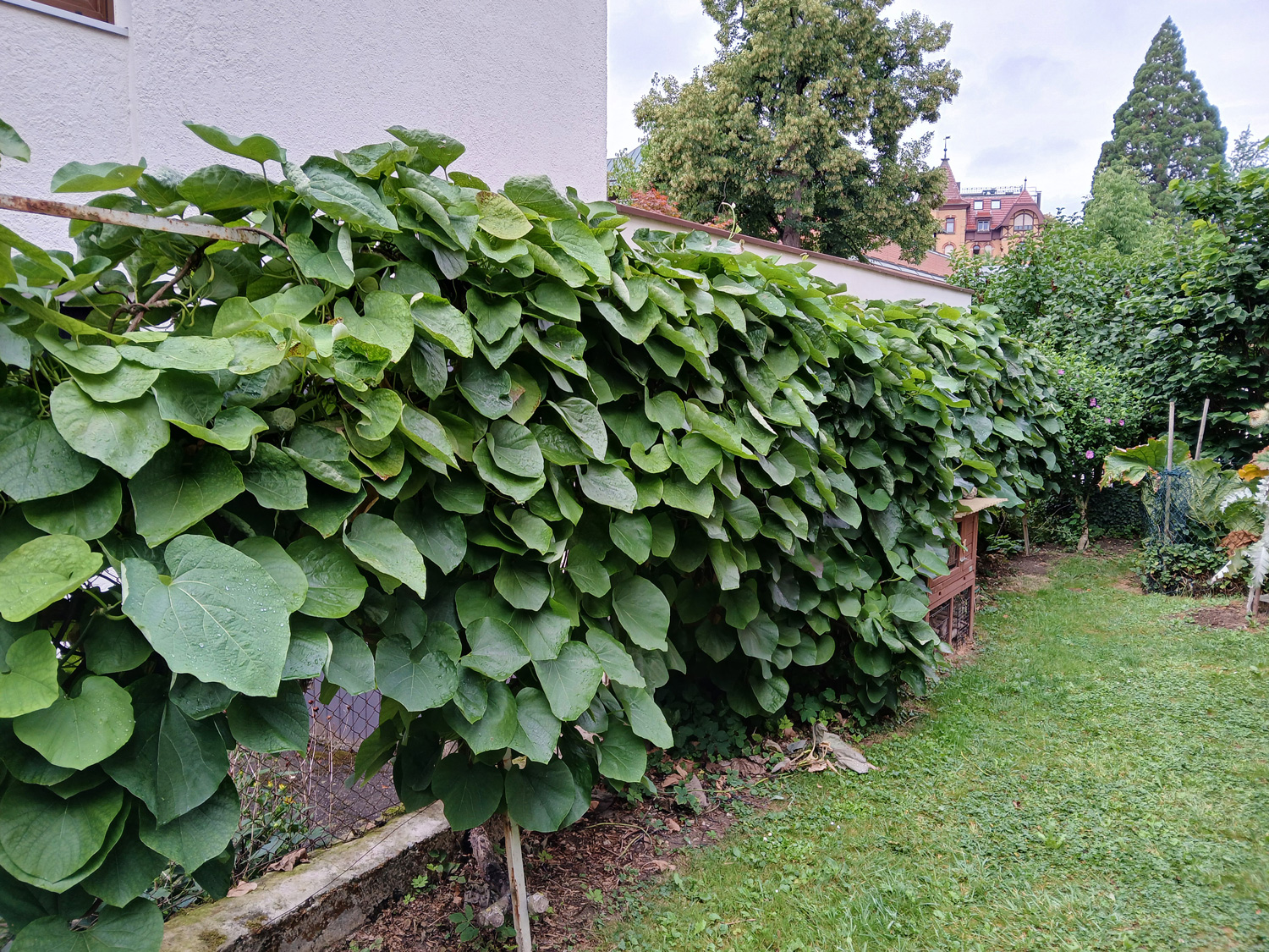 Bewächst über ca. 12 m Länge (bei 2 m Höhe) den Grenzzaun zum Nachbargebäude.