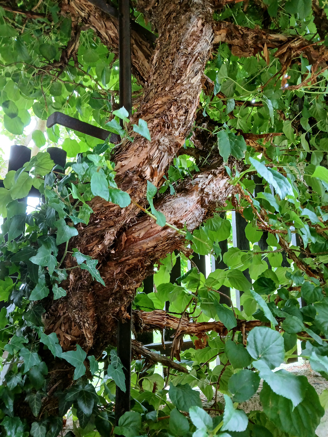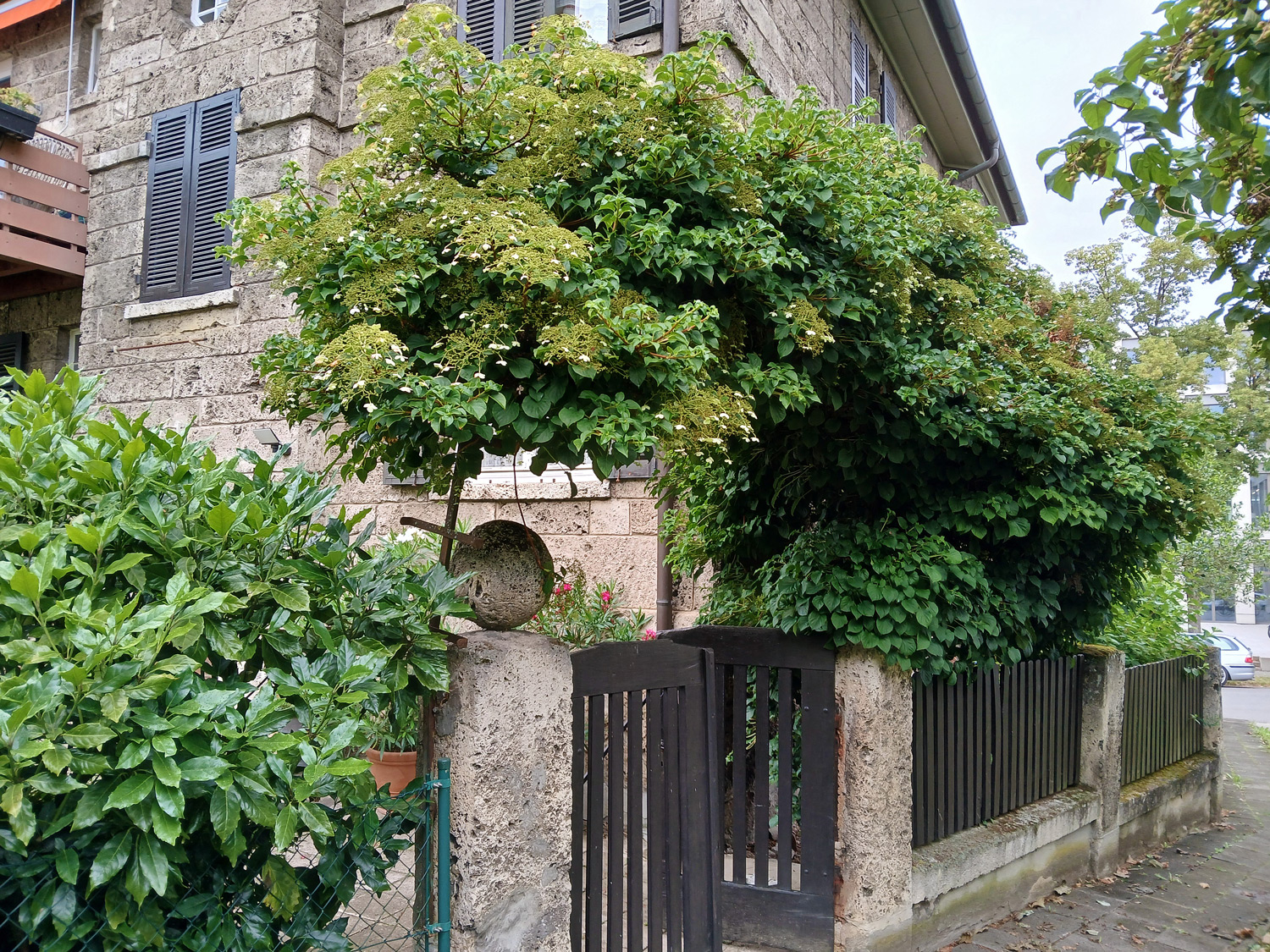 Die ab 1 m Höhe zweichsige Pflanze ist an dieser Stelle Nachfolgerin einer Pfeifenwinde. Laut Angabe des Eigentümers erst gut 20 Jahre alt.