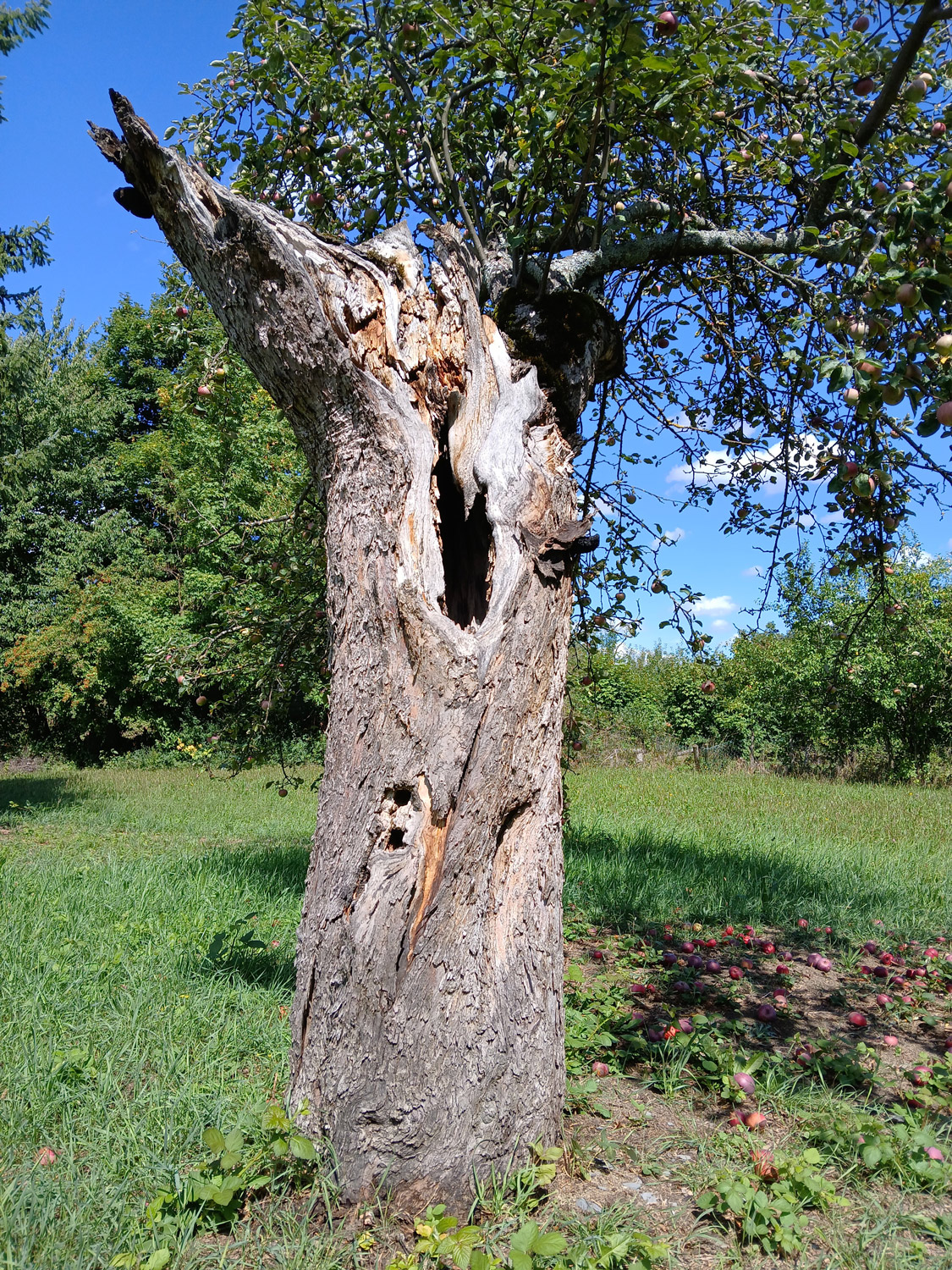 Am Kronenansatz in 2 m Höhe bildet der letzte noch lebende Ast mit einigen Neutrieben eine kleine Sekundärkrone. Stamm ist komplett hohl und teilweise offen, ausgemorscht.