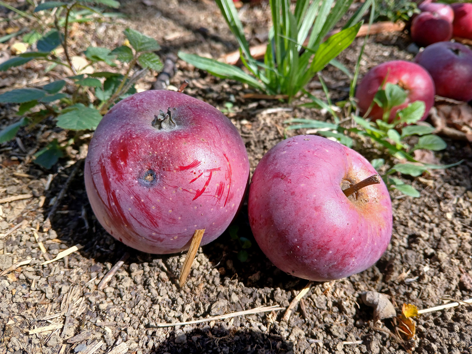 Früchte bereits teilweise am Boden, breit-rundlich, um 50 x 60 mm, stielseitig abgeflacht. Grundfarbe grün, allmählich bis zur Reife immer mehr von der kräftig roten Deckfarbe überlagert und zusätzlich hell-bläulich bereift. Auf der glatten (abgeriebenen) Schale sind die hellen Lentizellen deutlich sichtbar. Nur geringe, strahlige Berostung in der tiefen Stielgrube. Stiel 10-15 mm lang, mitteldick, braun. Kelch geschlossen in flacher, etwas höckeriger Kelchgrube. Kelchblätter kurz und dicht zusammengeneigt. Kelchgrube geht direkt in die Kelchhöhle über. Gefäßbündellinie breit-zwiebelförmig.