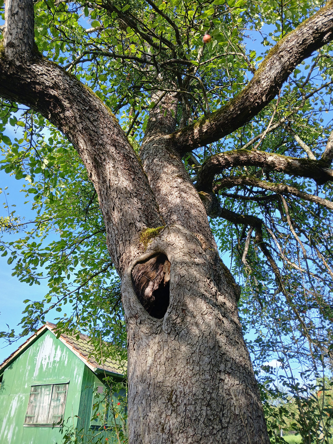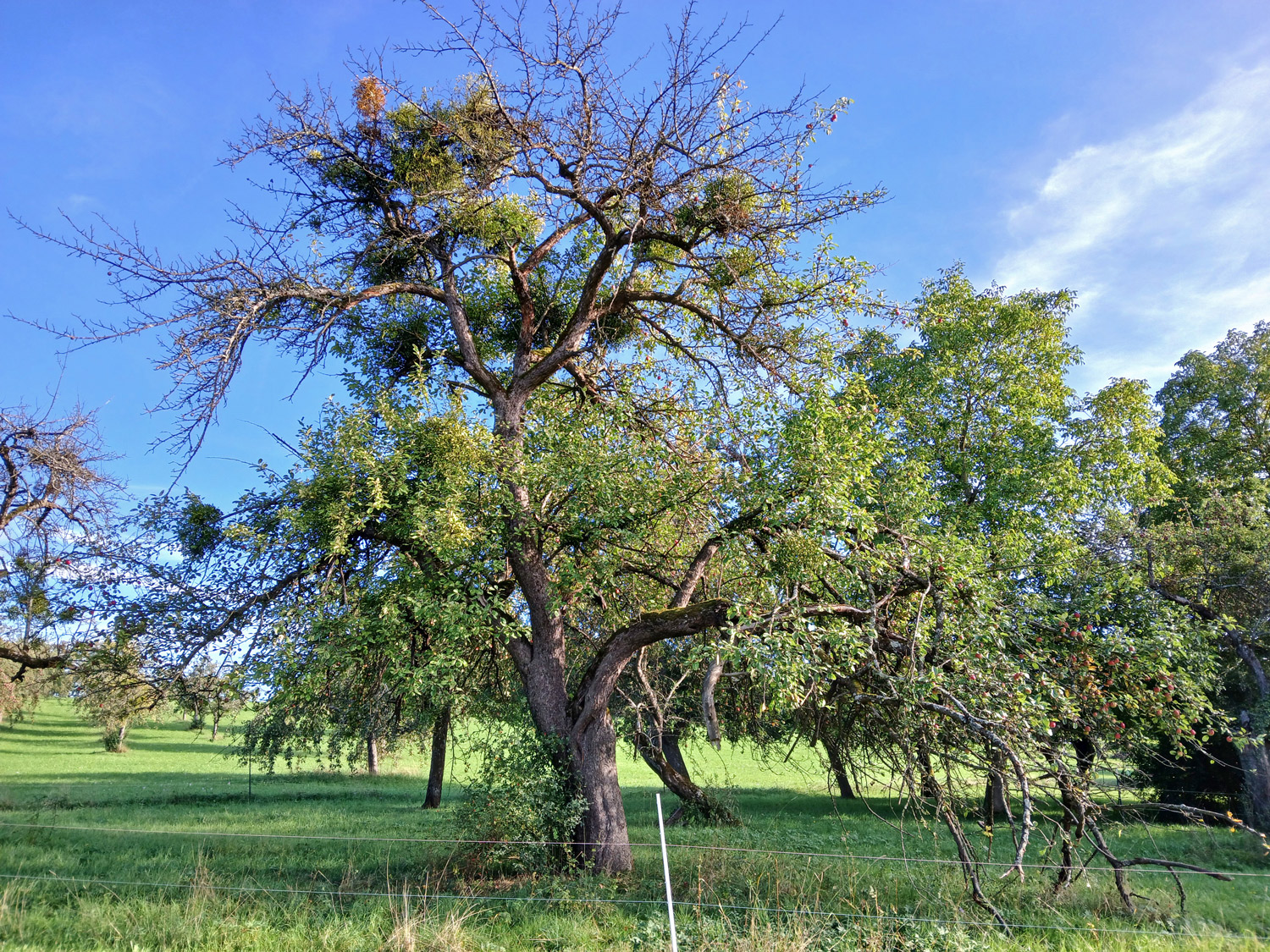 Sehr alter, uriger Habitatbaum mit breiter, vielfach trockener und mit vielen Misteln besetzter Krone. Ab 1,8 m Höhe zwei Hauptachsen, eine dritte ist vor langer Zeit ausgebrochen und hat eine große Höhlung verursacht. Sie reicht allerdings nicht weit in den Stamm hinab.