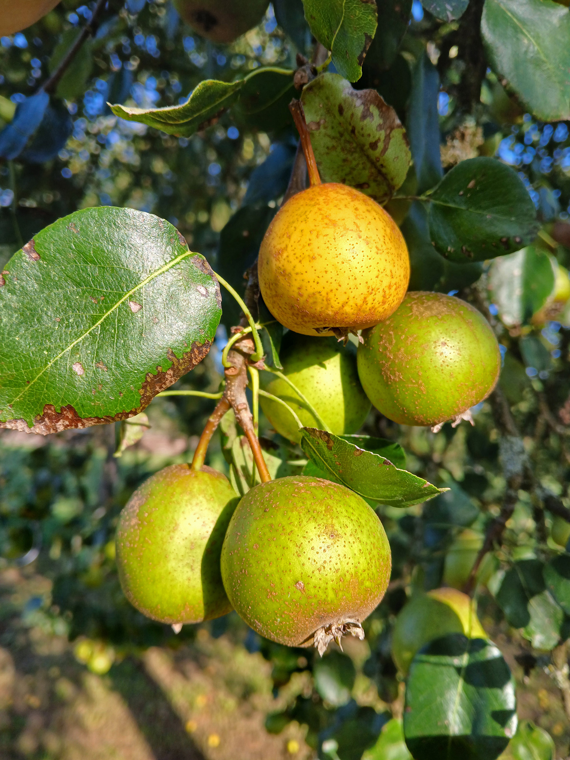 Herkunft wahrscheinlich Schweiz, ab 1870 bekannt. In Süddeutschland häufiger vorkommend, geringe Standort-Ansprüche, aber hohe Anfälligkeit gegen Feuerbrand. Verwendung als Most-, Dörr- und Brennbirne. Früchte am 23.8.24: Rundlich-kreiselförmig, bis 50 x 50 mm, am Baum schmutzig-grün, am Boden gelb. Viele dunkle Lentizellen, am Kelch stark berostet, sonst oft kleine Rostfiguren. Stiel mittelstark, braun, ca. 20 mm lang.