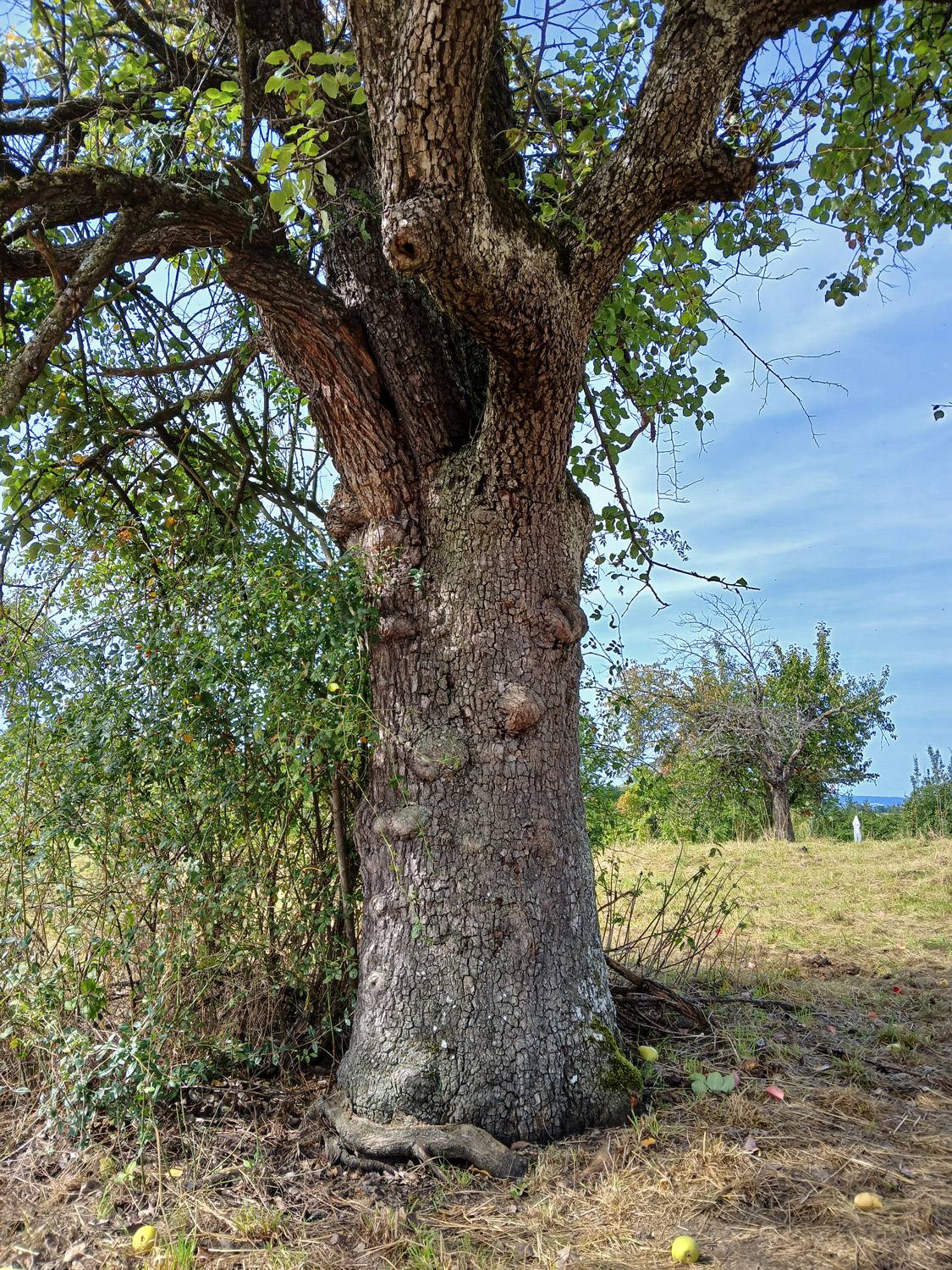 Urige, stark abgängige, aber noch vitale Birnenruine mit dickem Stamm (Umfang wegen Wildrosenbewuchs nicht messbar, Durchmesser ca. 80 cm). Drei Hauptachsen, eine vierte ist ausgebrochen. Hier und auch an einem der starken Kronenäste ist eine große Höhlung vorhanden. Stamm scheint aber nicht hohl zu sein. Ungewöhnlich geschlossene Borke, unregelmäßig gefeldert, aber mit deutlich feineren Rissen als an den Hauptästen – vermutlich bei etwa 2 m Höhe veredelt. Somit wäre ein Stammbildner vorhanden und der Umfang bezieht sich nicht auf die Sorte.