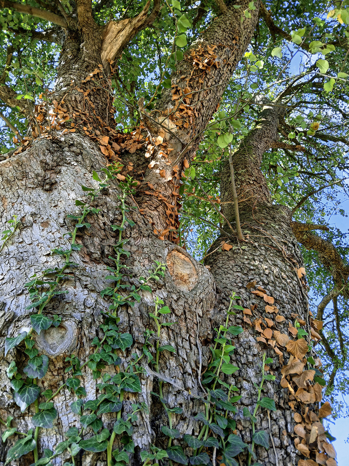 Ab 1,8 m Höhe Aufteilung in eine starke und eine schwächere Hauptachse, erstere gabelt sich dann gleich in zwei Äste. Vier starke Äste sind am Kronenansatz ausgebrochen bzw. abgenommen. Stamm mit Efeubewuchs.