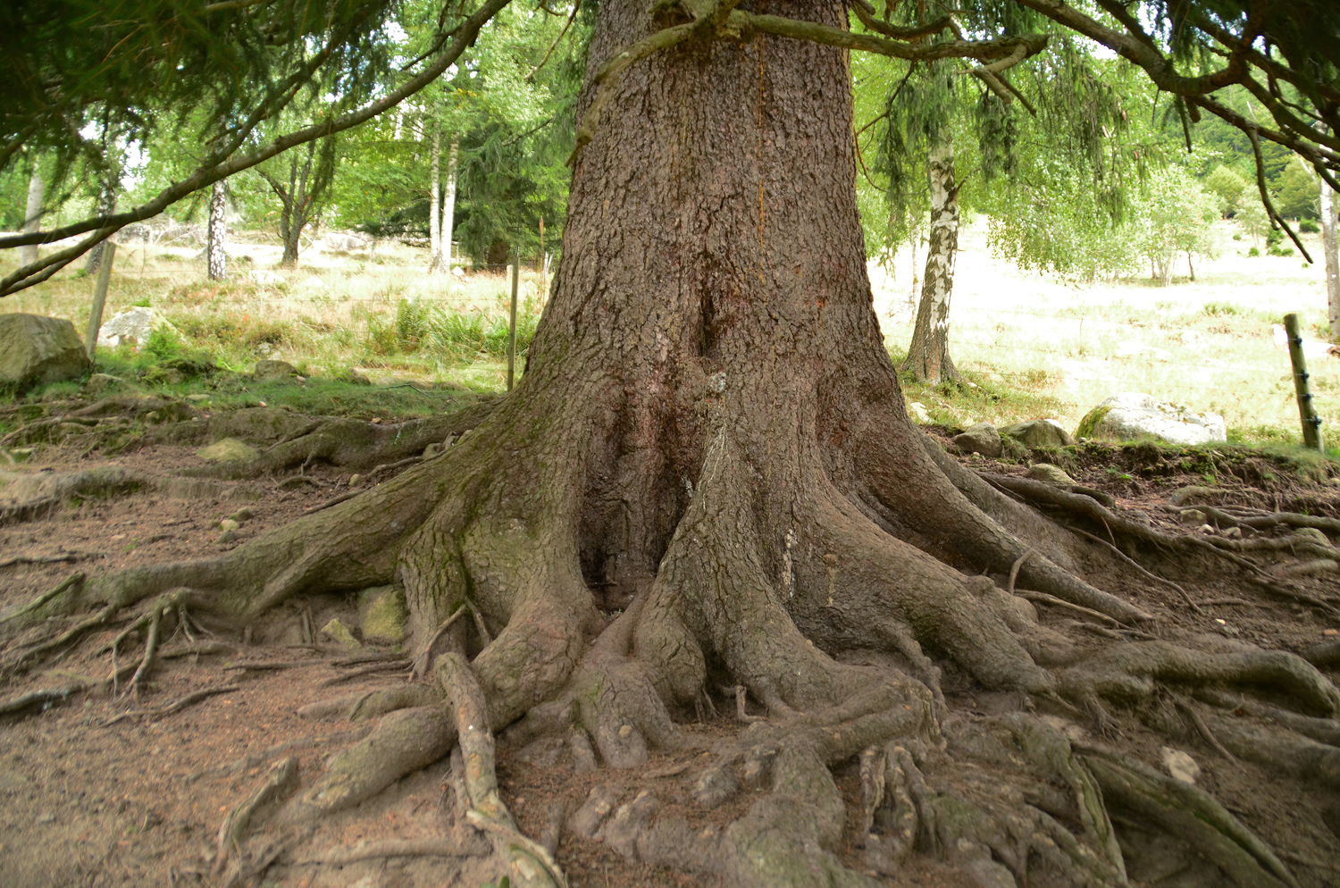 Mächtige, inzwischen schüttere Weidfichte mit starken Wurzelanläufen.