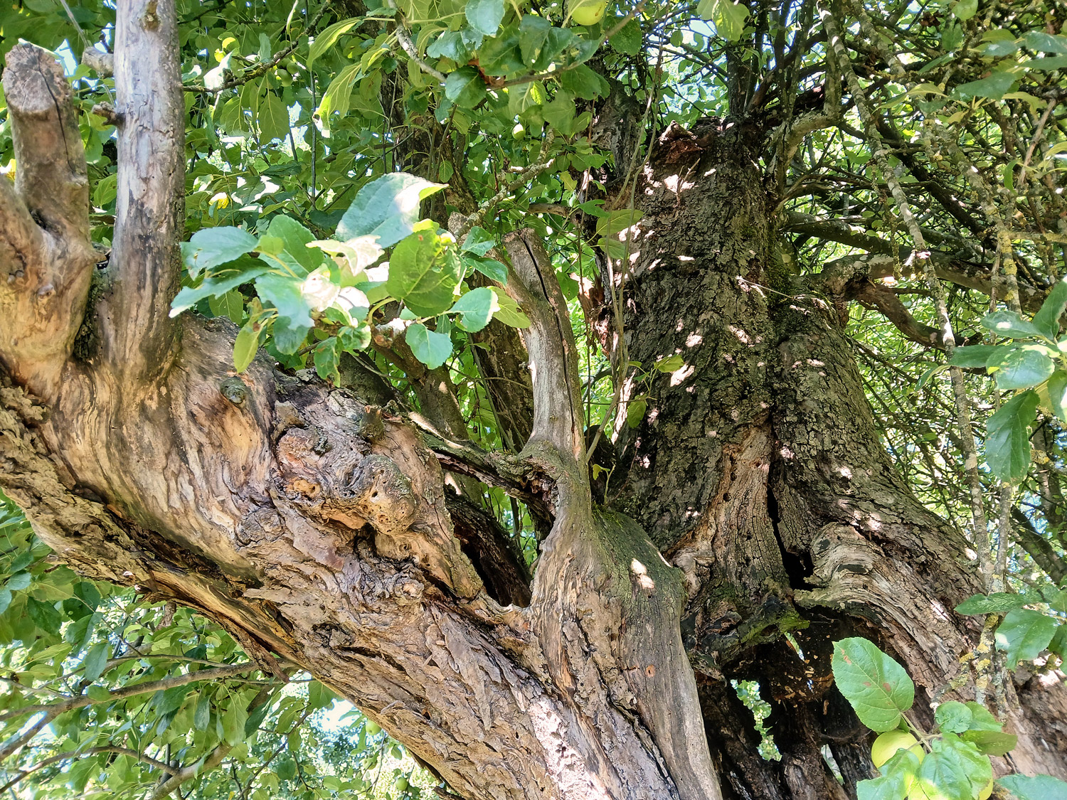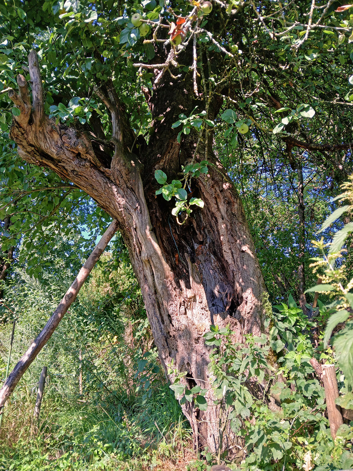 Sehr alter, völlig hohler und stammoffener Baum. Hauptachse bis 4 m Höhe noch vorhanden, allerdings bis oben hohl. Zweiter, seitlich bei 2 m Höhe abgehender Stämmling ist nur noch als kurzes, offenes Relikt vorhanden – doch selbst aus diesem erwächst noch ein junger, grünender Ast.