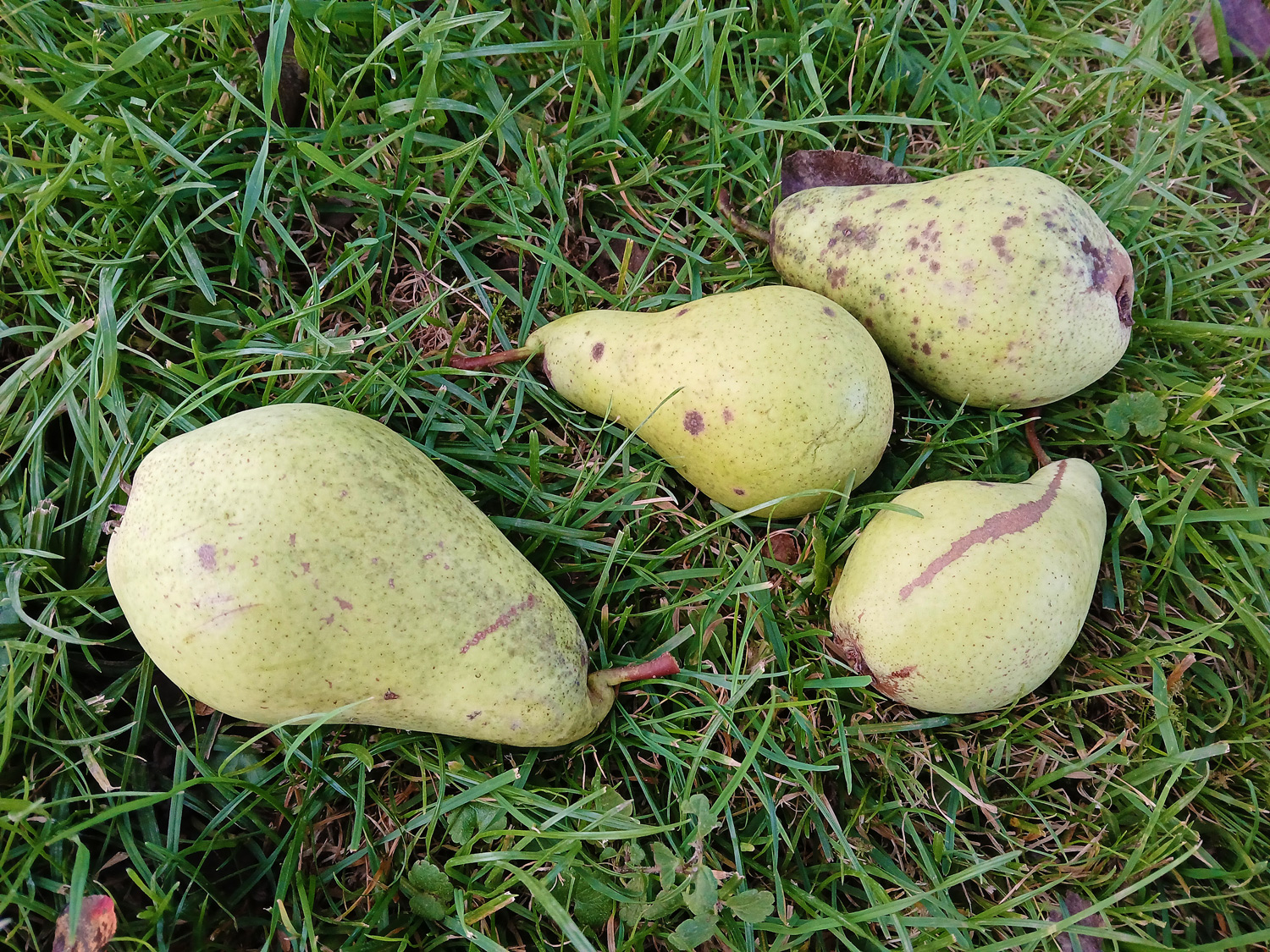 Tafel- und Kochbirne, 1882 in Frankreich gezüchtet. Früchte am 12.10.2025 teils abgefallen (am 20.10. alle), aber auch am Boden hellgrün, höchtens leicht gelblich, ohne Deckfarbe. Lang birnenförmig, stielseitig eingeschnürt, recht groß (um 90 x 60 mm, Gewicht um 150 gr.). Schale mit vielen, kleinen, grün umhöften Lentizellen sowie Schorfflecken. Stielseitig wulstig verdickt. Der 15-20 mm lange, kräftige, holzige Stiel wird dadurch oft zur Seite gedrückt. Kelchseite mit kleiner, flacher Kelchgrube nur wenig abgeflacht. Kelchblätter mittellang, an der Basis verwachsen und meist krönchenartig aufgerichtet bis umgeschlagen. Kerne braun, lang zugespitzt, um 9 x 4 x 2 mm.