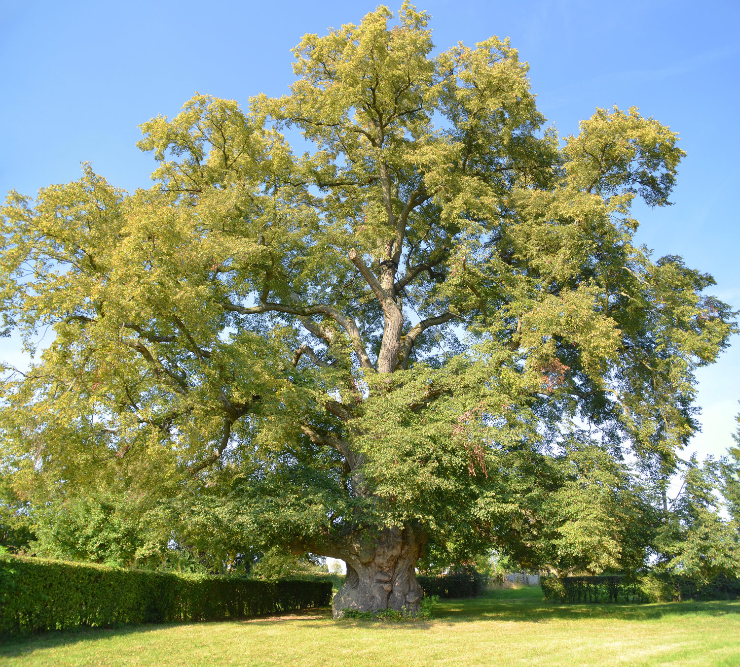 Alle zehn Hauptachsen sind durch Seilsicherungen mit dem Zentralstamm verbunden. Wunderschönes Baumdenkmal auf freigehaltener und umhegter Fläche. Sockelumfang 7,81 m (2020).