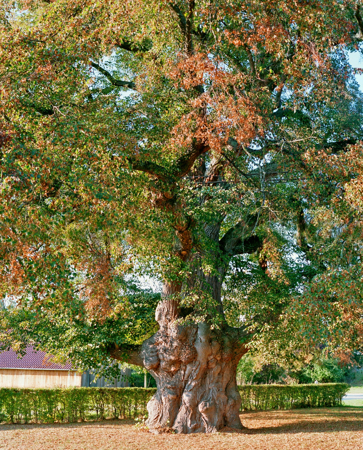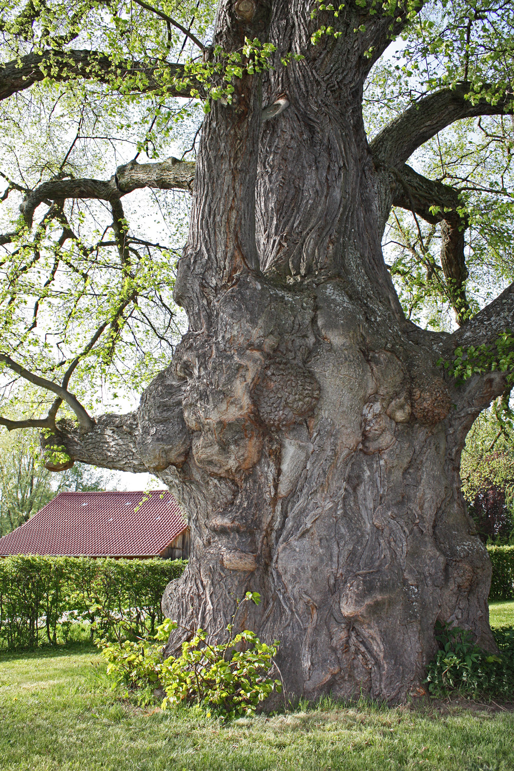 Massiger, von vielen Wucherungen und Maserknollen überzogener Stamm. Krone von eindrucksvoller Größe, obwohl einige südseitige Äste verloren gingen und zwei westseitige auf wenige Meter Länge eingekürzt wurden.