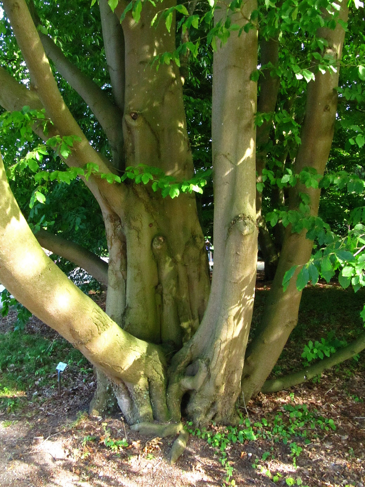 Zu zwei Seiten freistehend. Mit Kranz von Nebenstämmlingen ab Basis. Hauptstamm löst sich in 2 m Höhe auf.