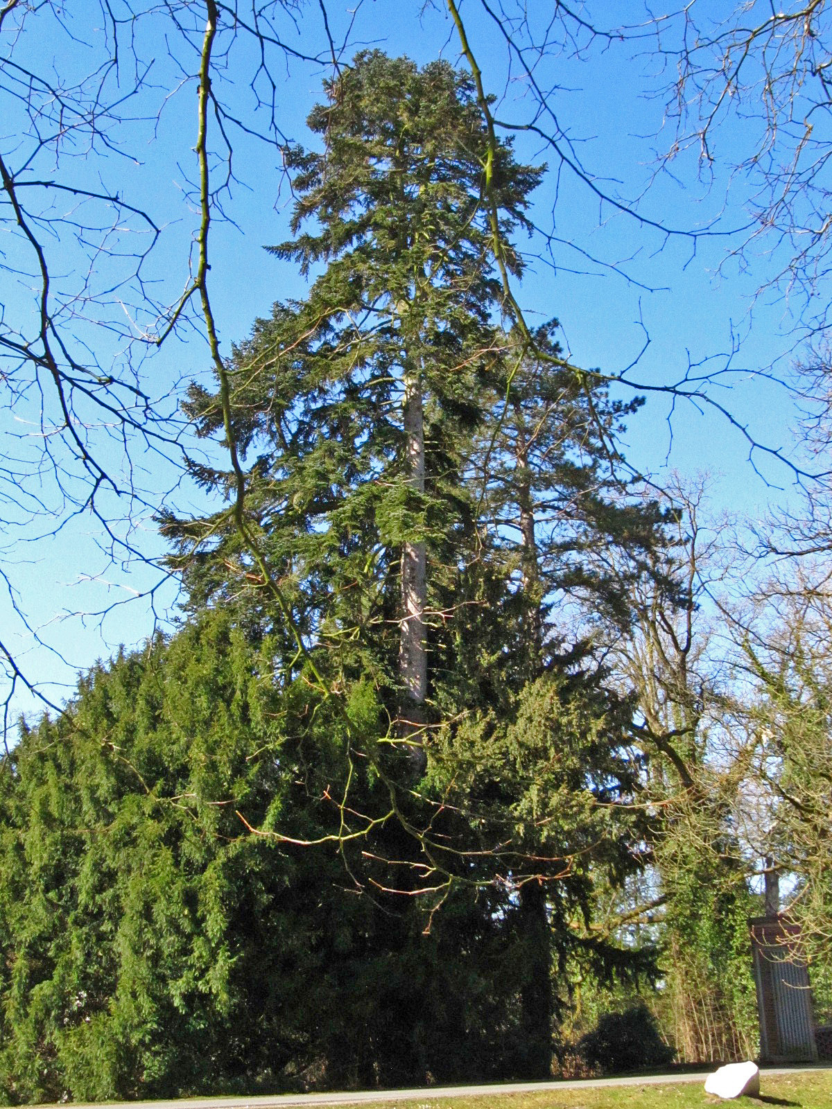 Krone freistehend, Stamm verschwindet in Eibengehölz. Wipfelbereich zwieselt.