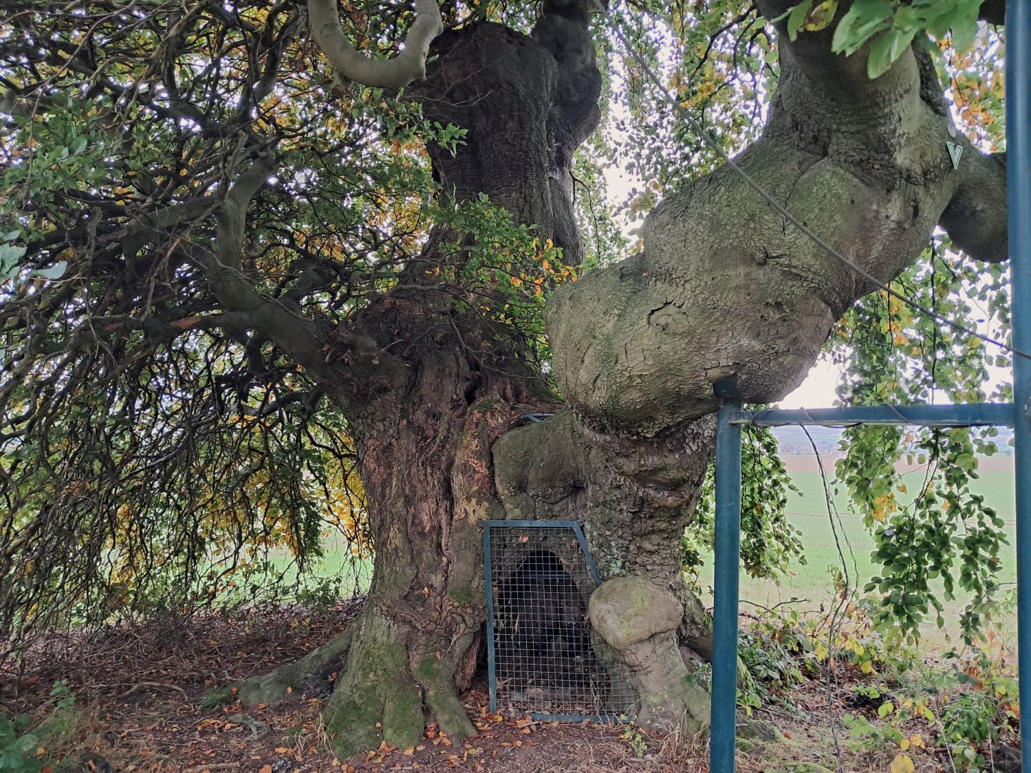 Aufteilung in zwei Hauptstämme, südlicher Hauptstamm mit herausgebrochenem Kronenteil, nördlicher Hauptstamm wird abgestützt.