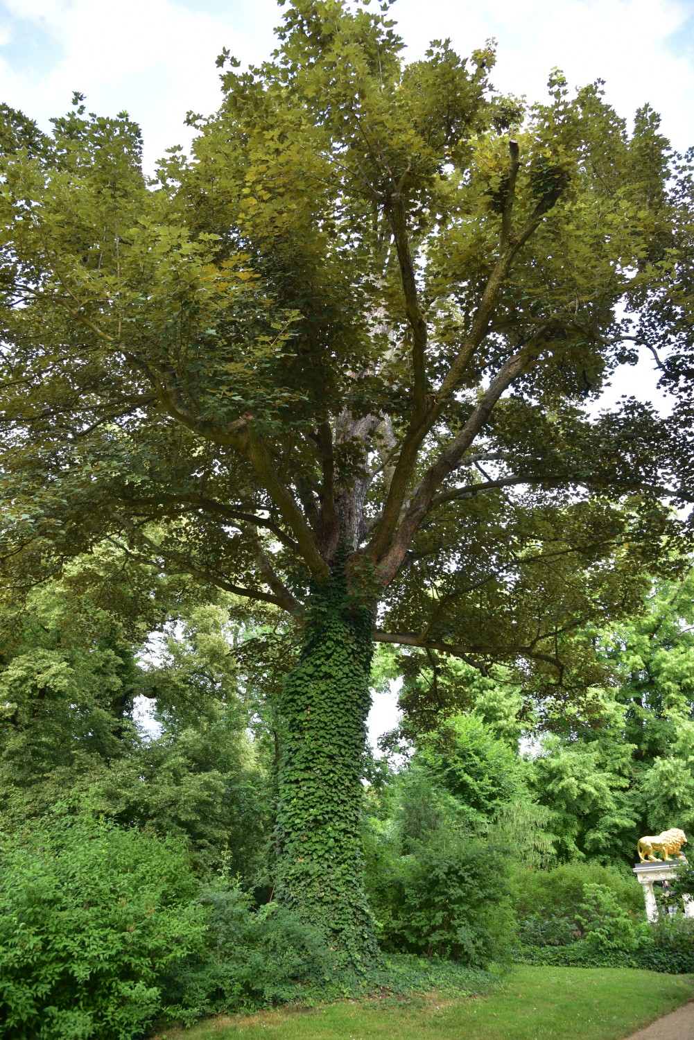 Durchgehender Stamm bis in ca. 6,5 m Höhe, vielastige, breite, straußförmige Krone. Stamm efeubewachsen.