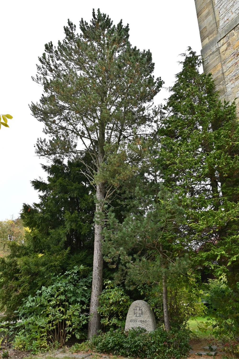 Am Kriegerdenkmal von 1945, Pflanzung evtl. in Zusammenhang mit Steinsetzung oder doch erst in den 1960ern erfolgt.