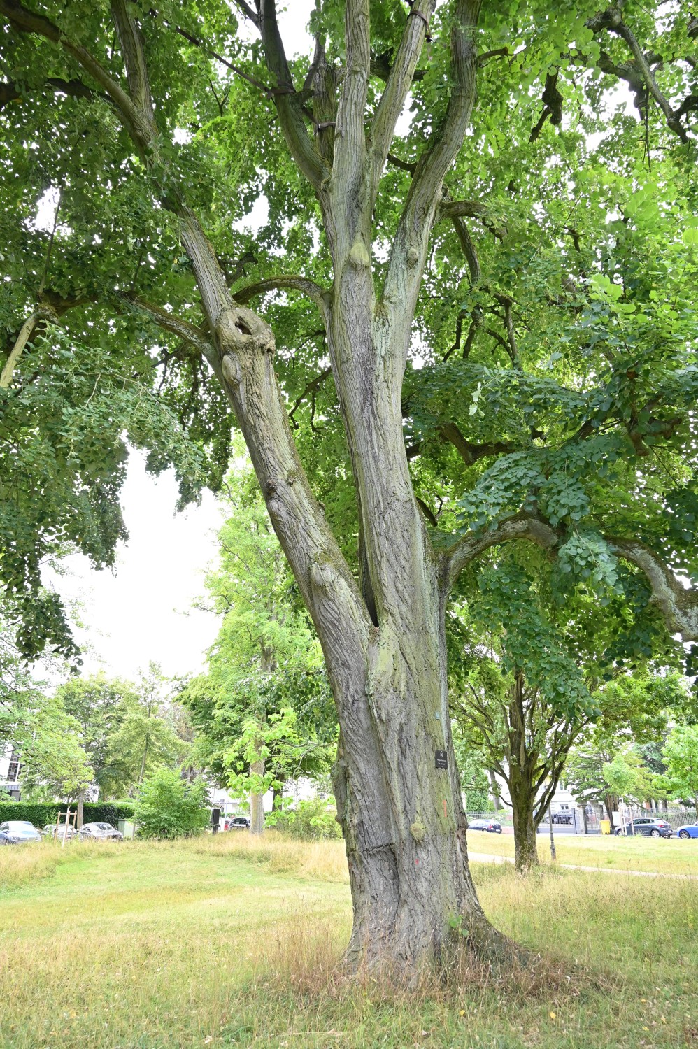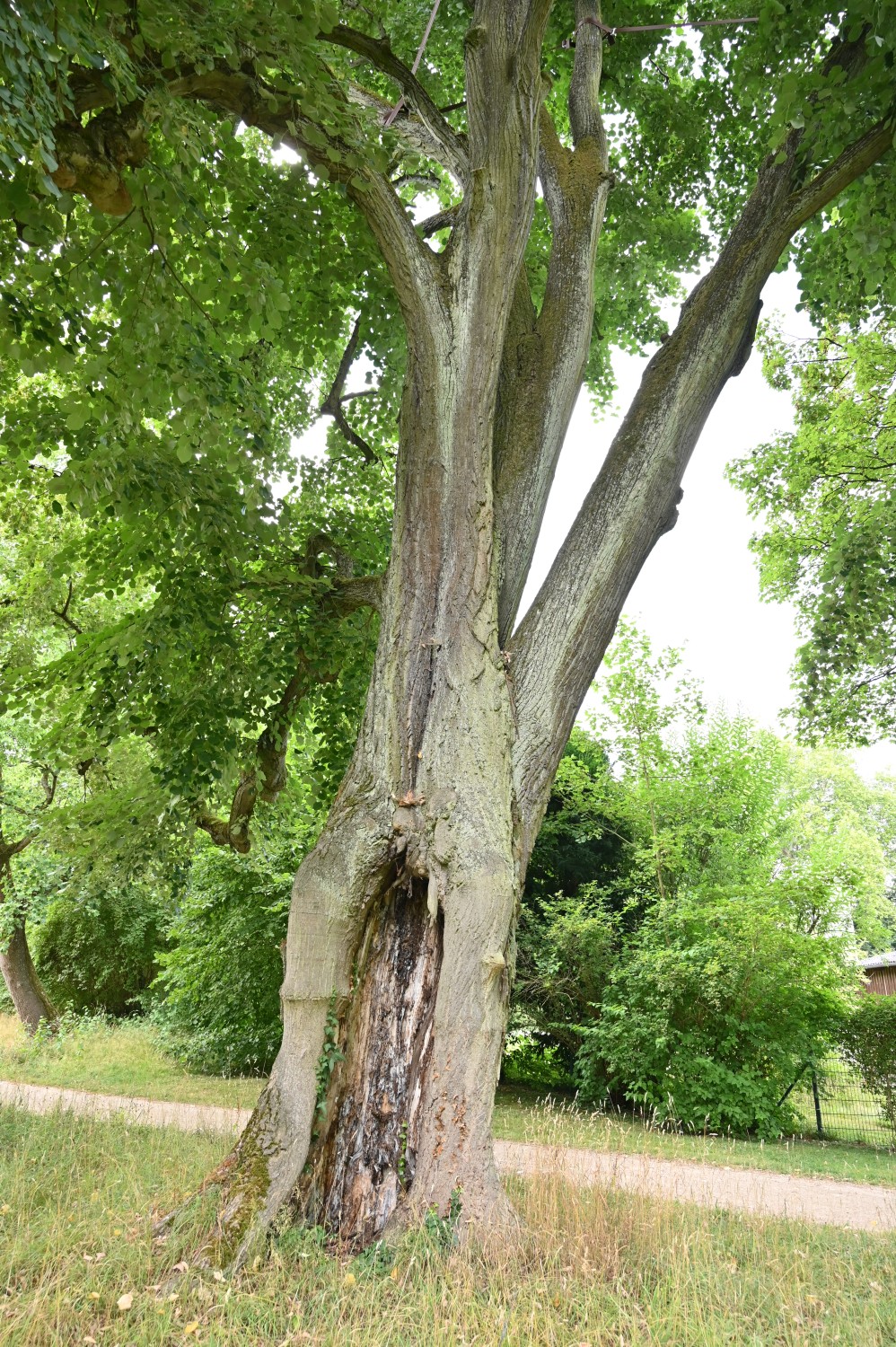 Solitär mit großer, breiter Krone ab ca. 2,5 m Höhe, steile Kronenstämme, große Öffnung/Höhlung im unteren Stammbereich bis auf den Boden.