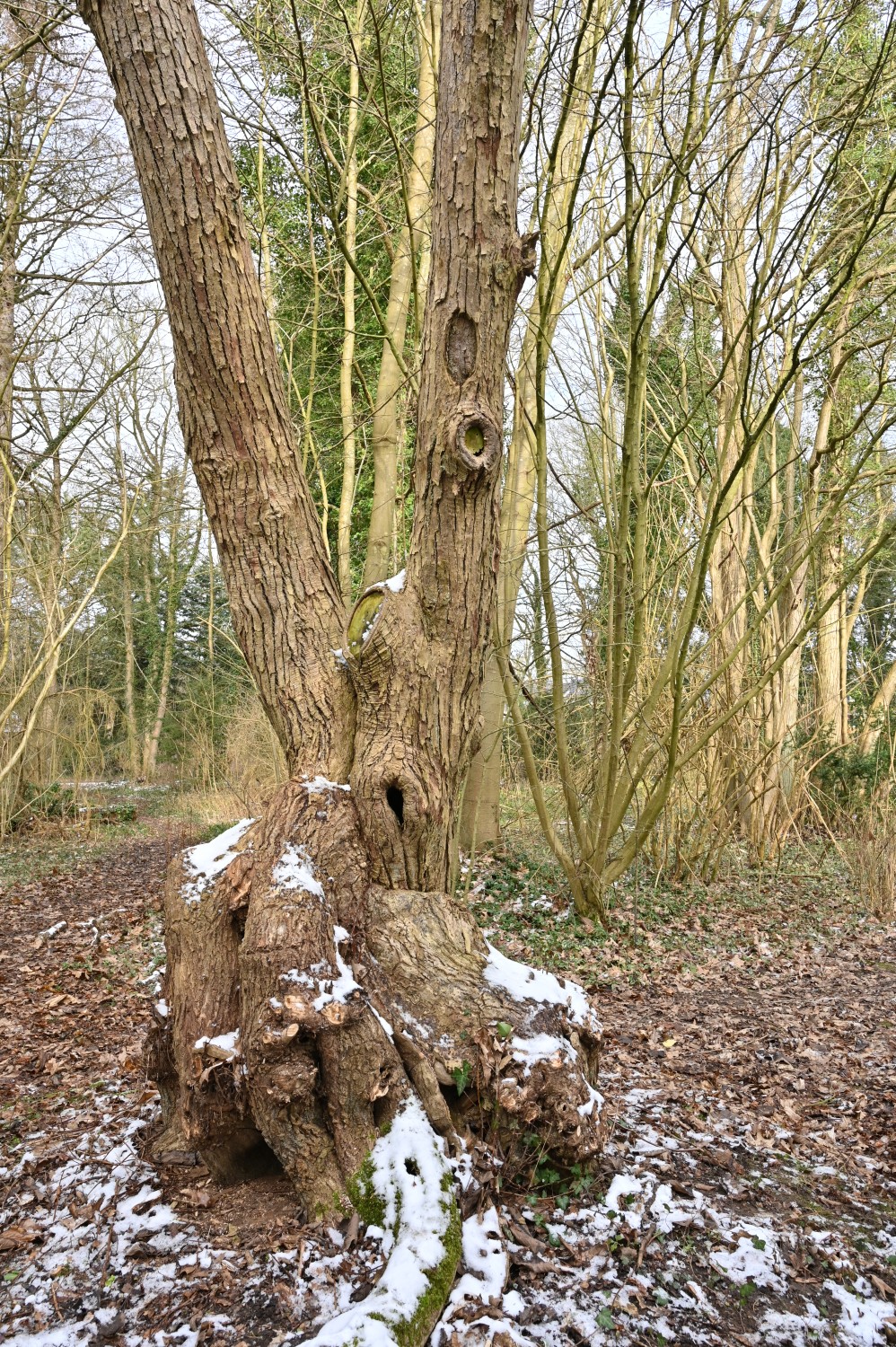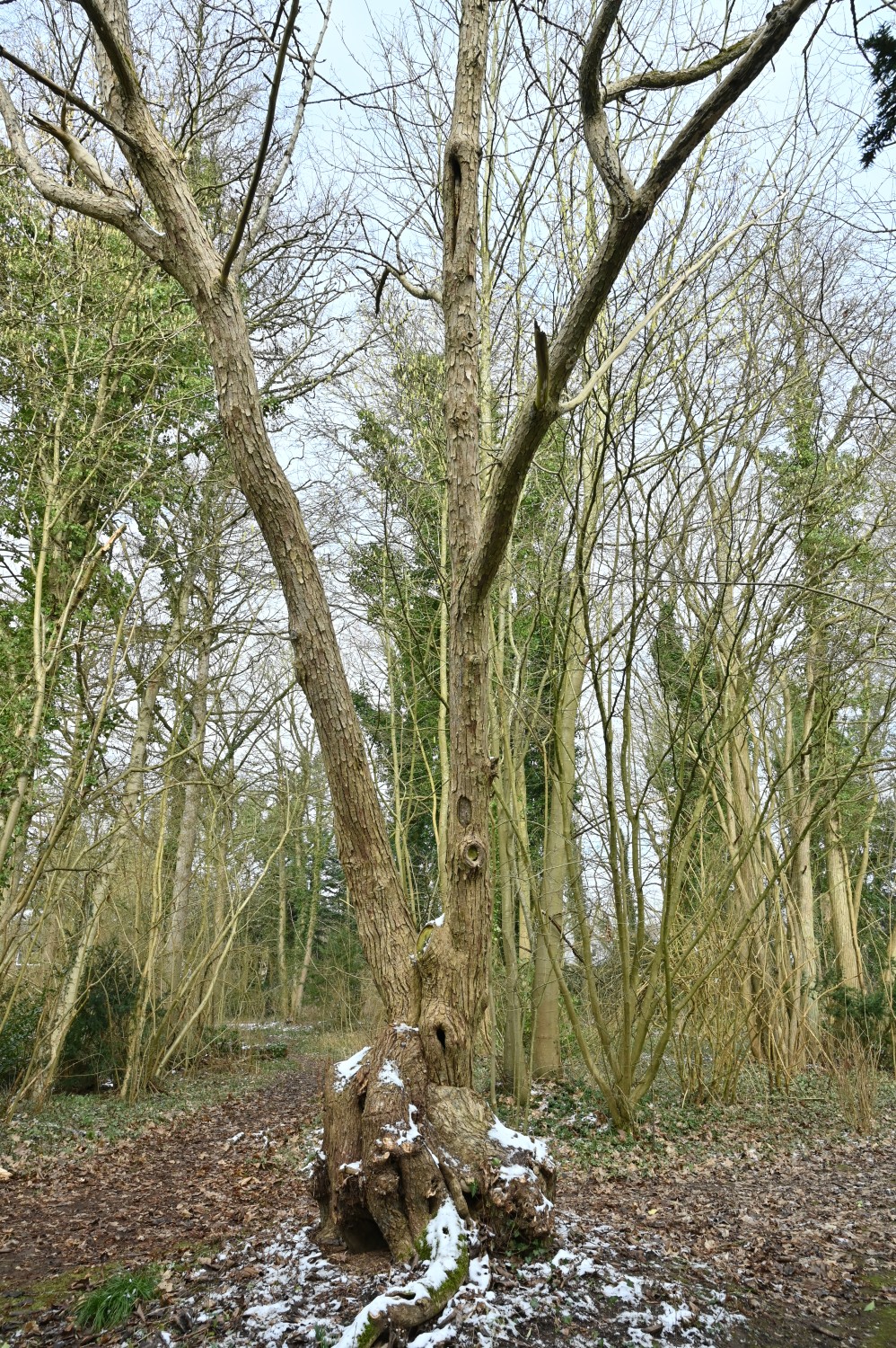 Bizarrer, verdickter und beuliger Stammsockel aus dem zwei geneigte Edelreise entspringen. Messung über beide zusammengewachsene Stämme.