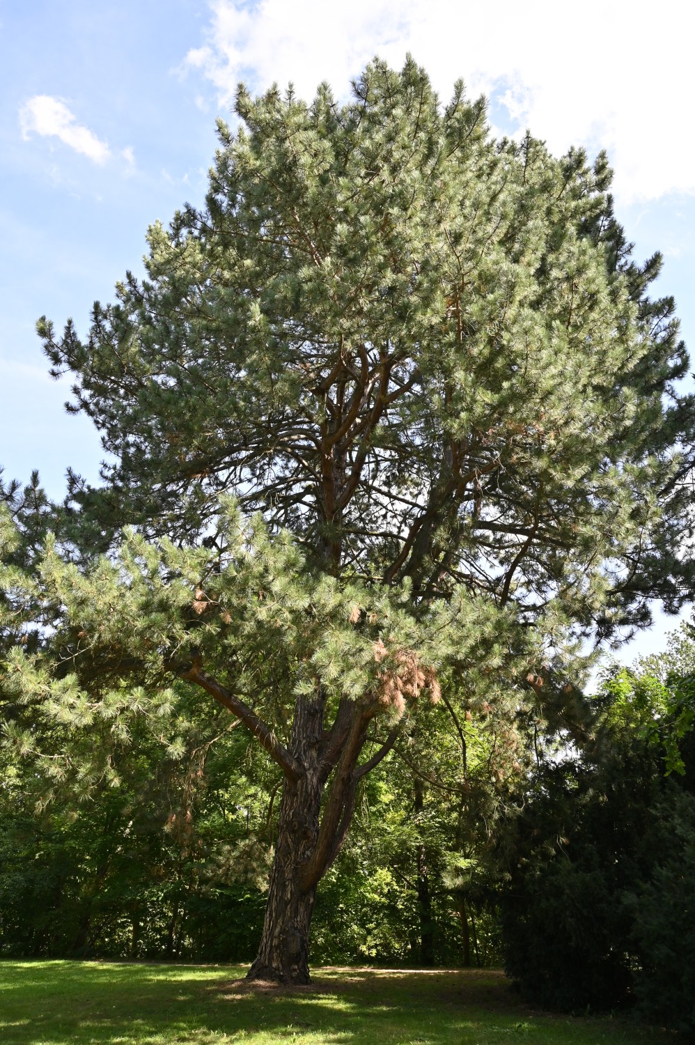 Leicht geneigter Stamm, tief angesetzte Starkäste, große Krone.