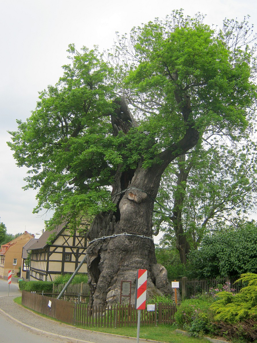 Einstämmig, Stamm hohl, starke Rindenschäden, noch zwei lebende Starkäste, zwei Stahlstützen, gut saniert, freistehend. Die ursprüngliche Krone ist 1819 komplett abgebrochen.